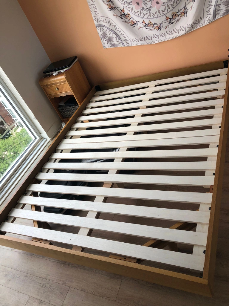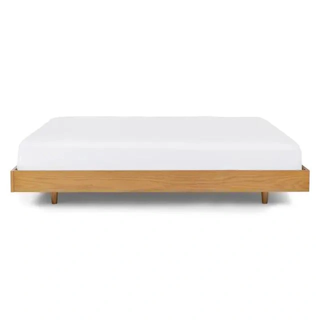 Basi bed frame from Article. Oak wood stain. Modern and dreamlike, the Basi floating bed lulls the sleepy with its sleek, minimalist style and super-solid construction. Using the highest quality veneer, solid-plywood support slats, and solid wood legs, the Basi will support your dreams for years to come. Queen size.