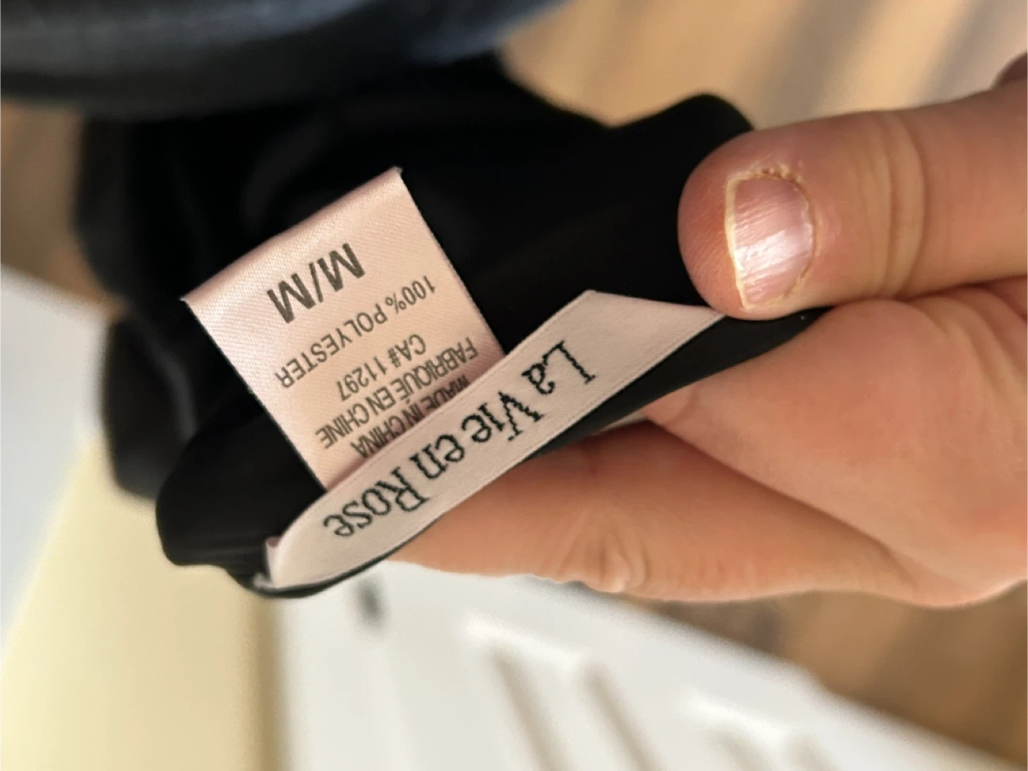 This La Vie en Rose dress is made of 100% polyester. It's a size medium (M/M) and comes in black. It's great for adding a touch of elegance to your outfit!