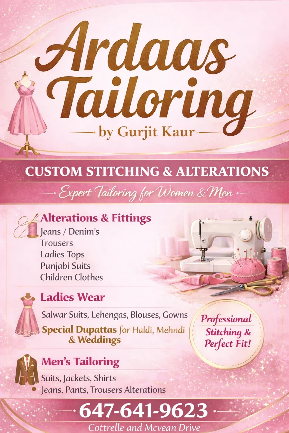 Expert tailoring for women and men, offering custom stitching and alterations. Services include jeans, trousers, Punjabi suits, blouses, gowns, and special duppattas for Haldi, Mehndi, and weddings. Get a professional stitch and perfect fit!