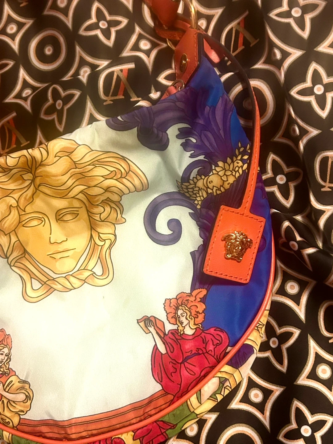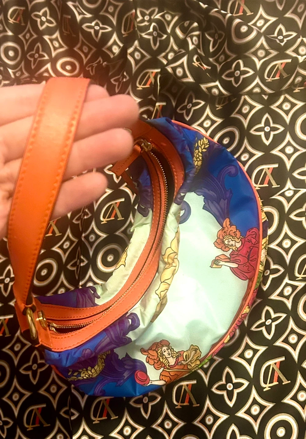 • Top golden zipper opens to a black nylon interior with orange leather Versace tag