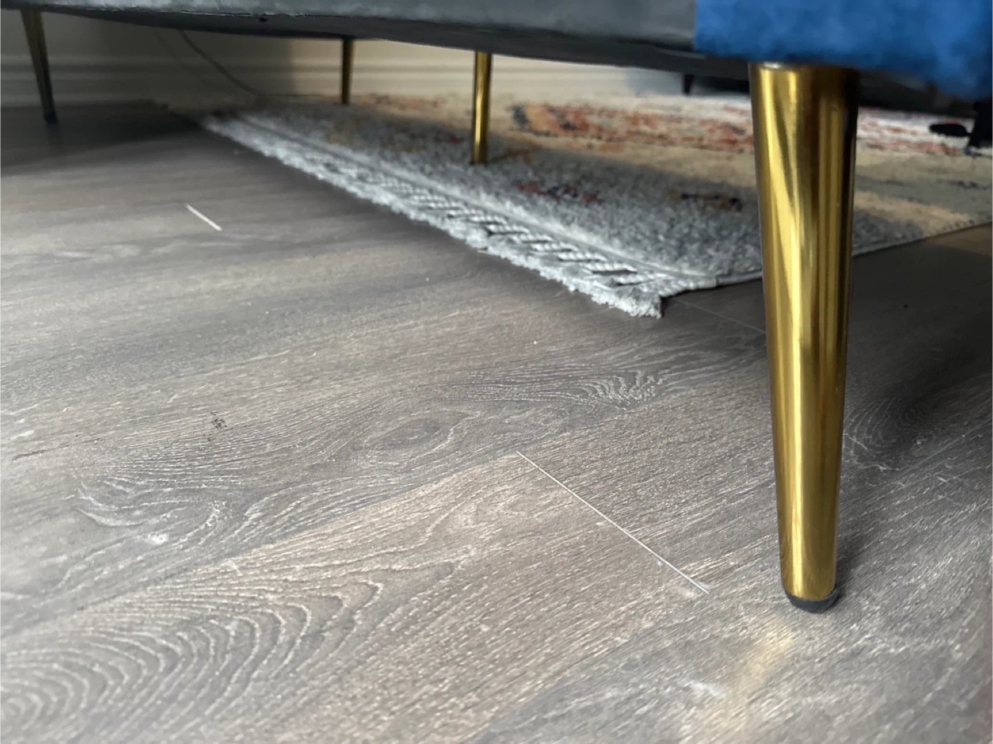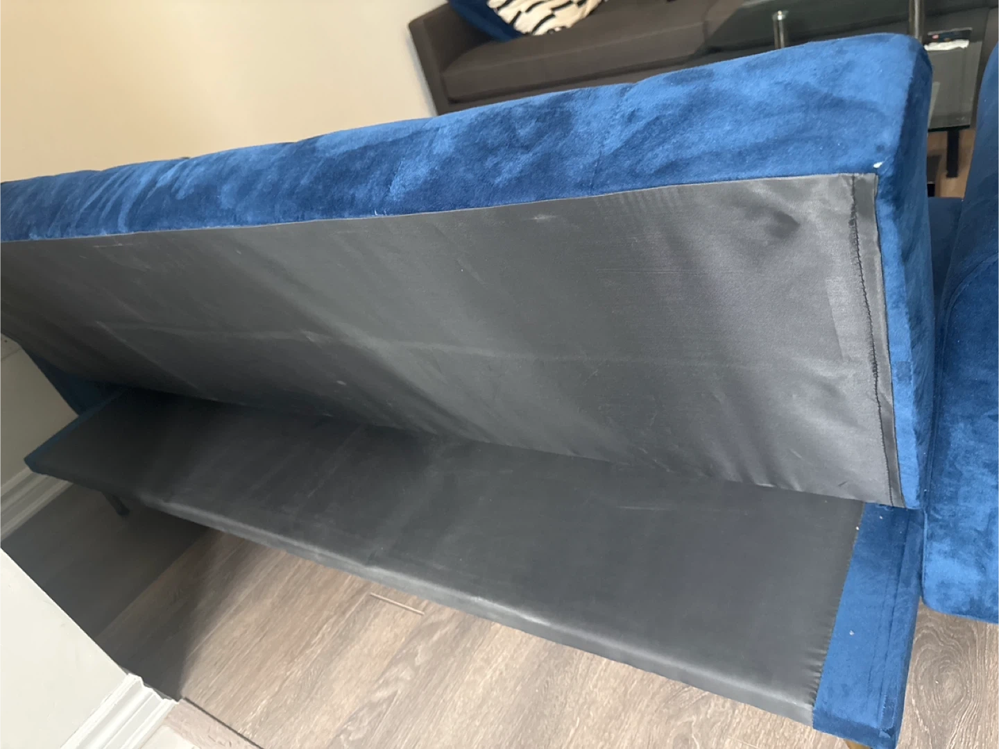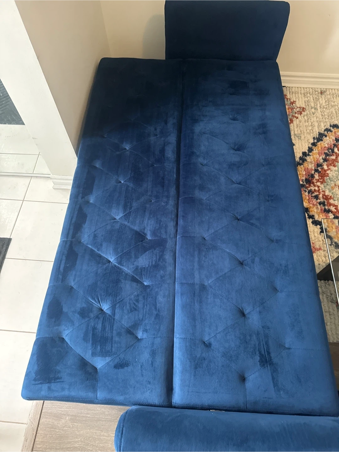 Stylish blue velvet sofa bed. It features a tufted design and rests on elegant gold-toned legs. Folds out for extra sleeping space. No pet no smoking no kids used very good condition. I bought only six months moving sale.