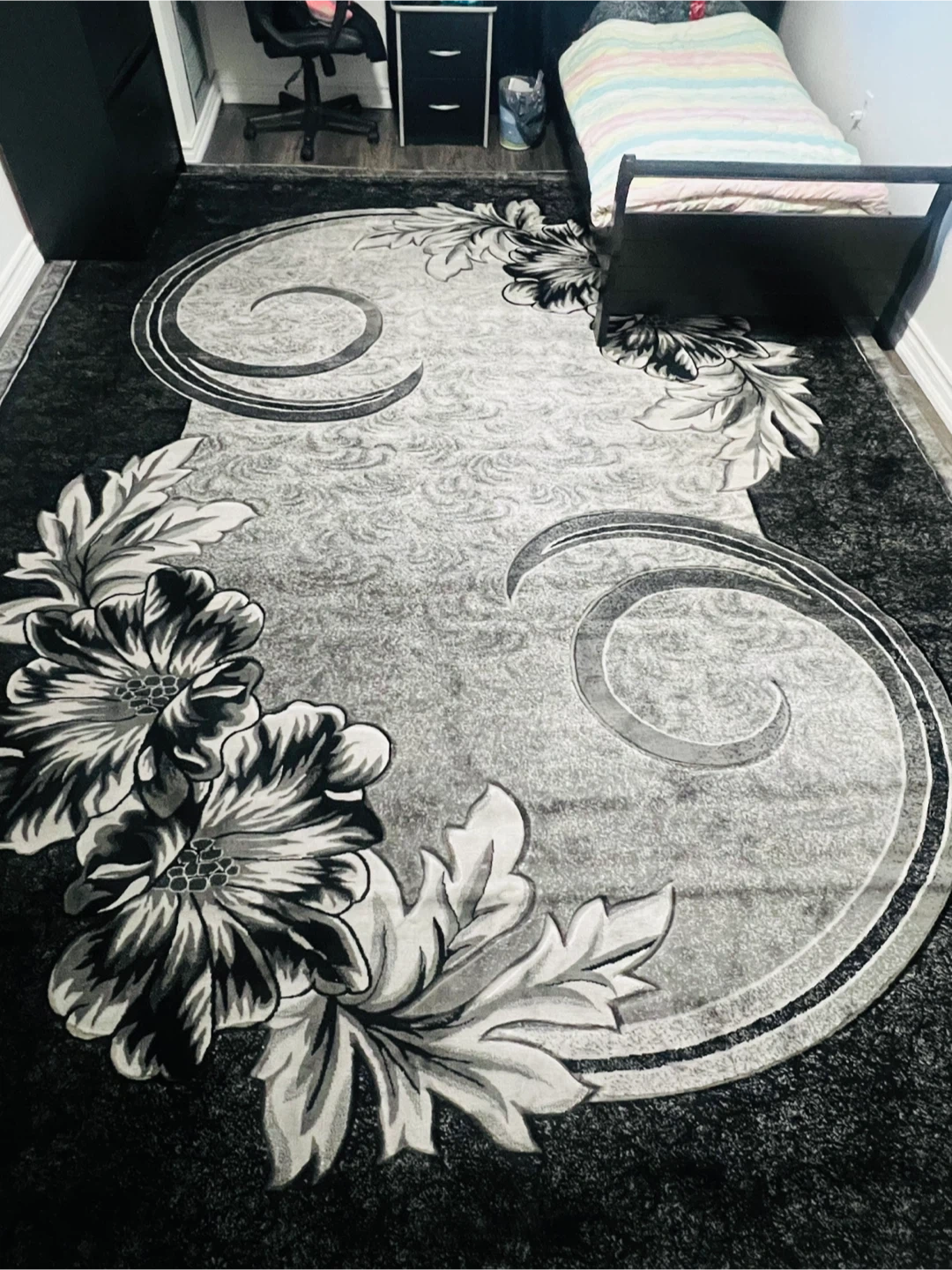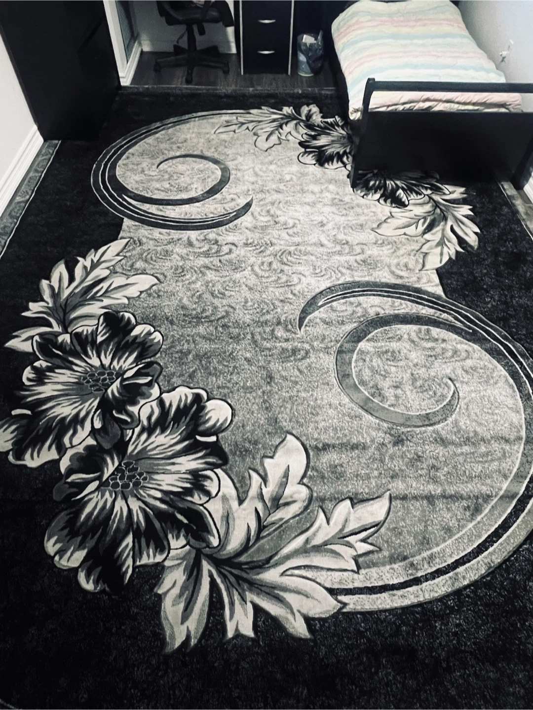This is a large area rug featuring a detailed floral and scroll pattern. It's primarily black and grey, offering a sophisticated look. The rug's texture is soft and inviting. Brand new rug just got it today March 1, 2026. Selling because a little over sized for my room.