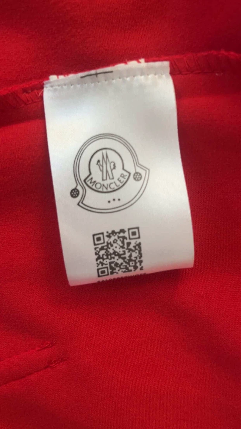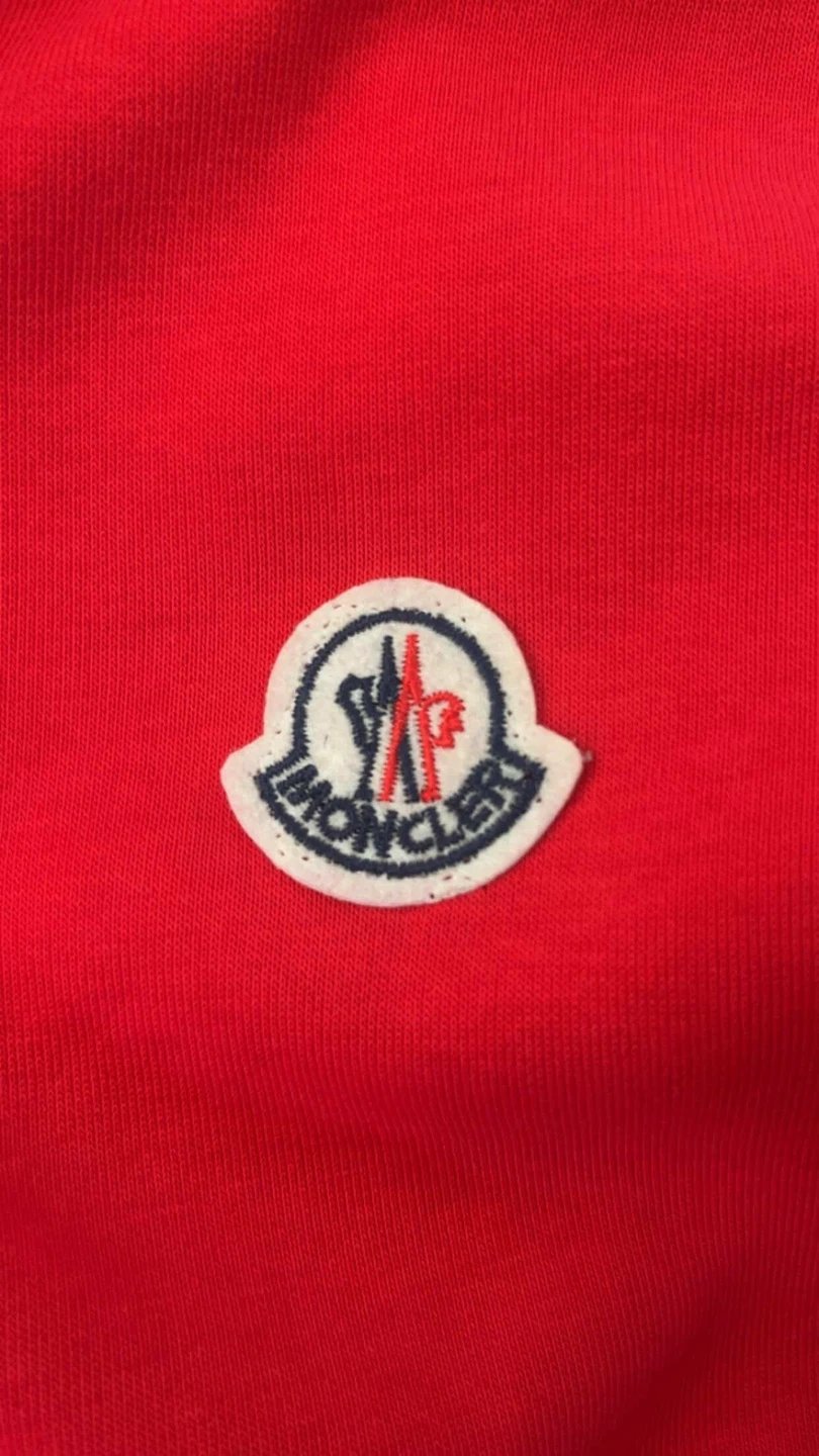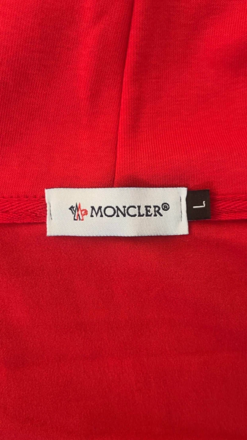 This is a red Moncler zip-up hoodie with a hood. It's a size large. Features the classic Moncler logo patch on the chest. It's perfect for cooler weather!