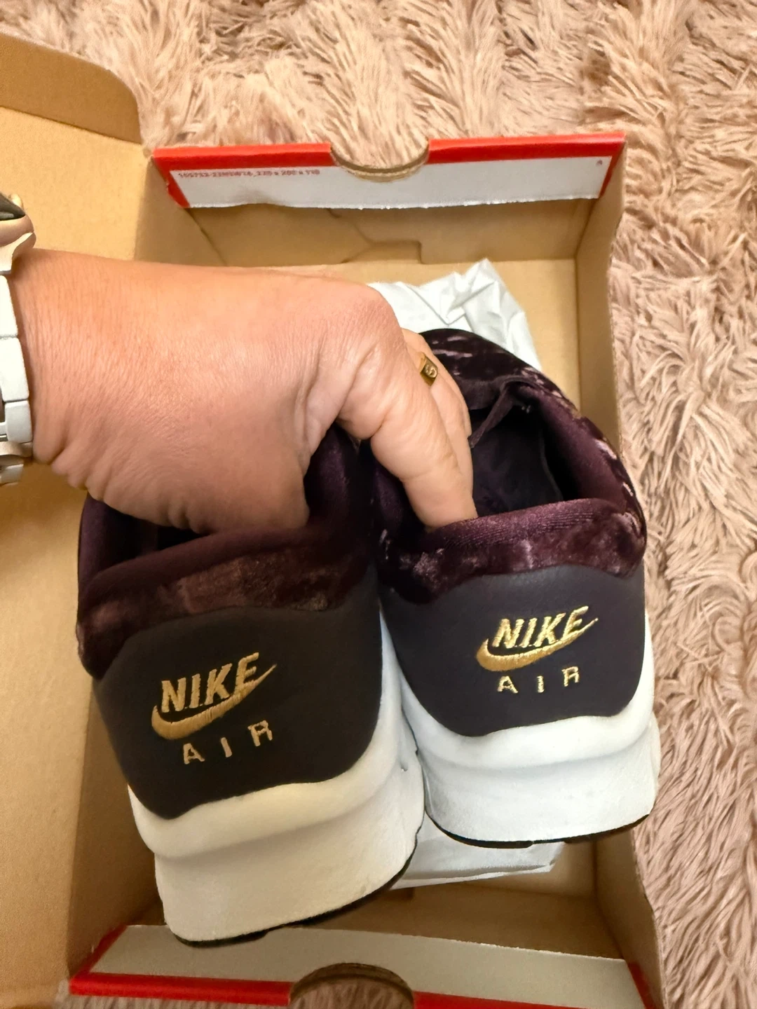 Nike Air sneakers in a rich burgundy velvet material. Comes with the original box. These shoes are size 7 and offer a stylish look and comfortable fit.