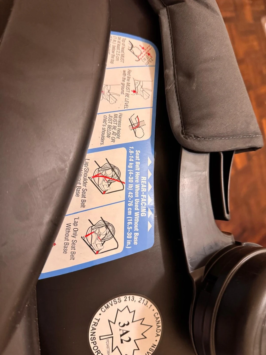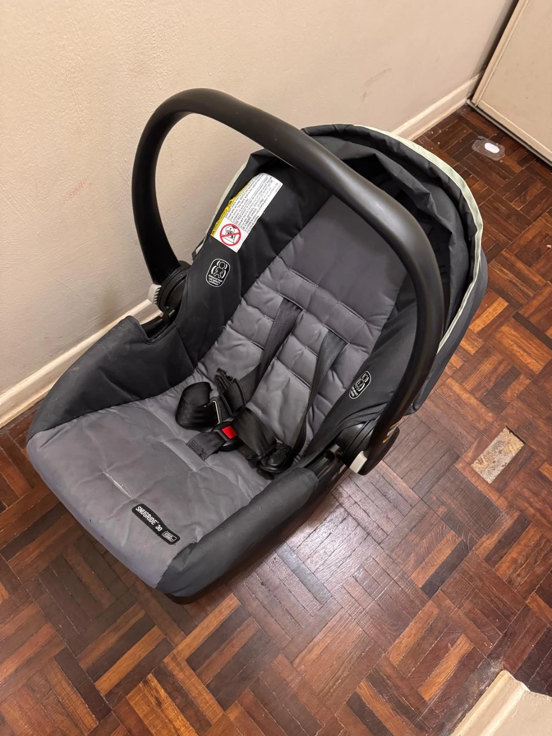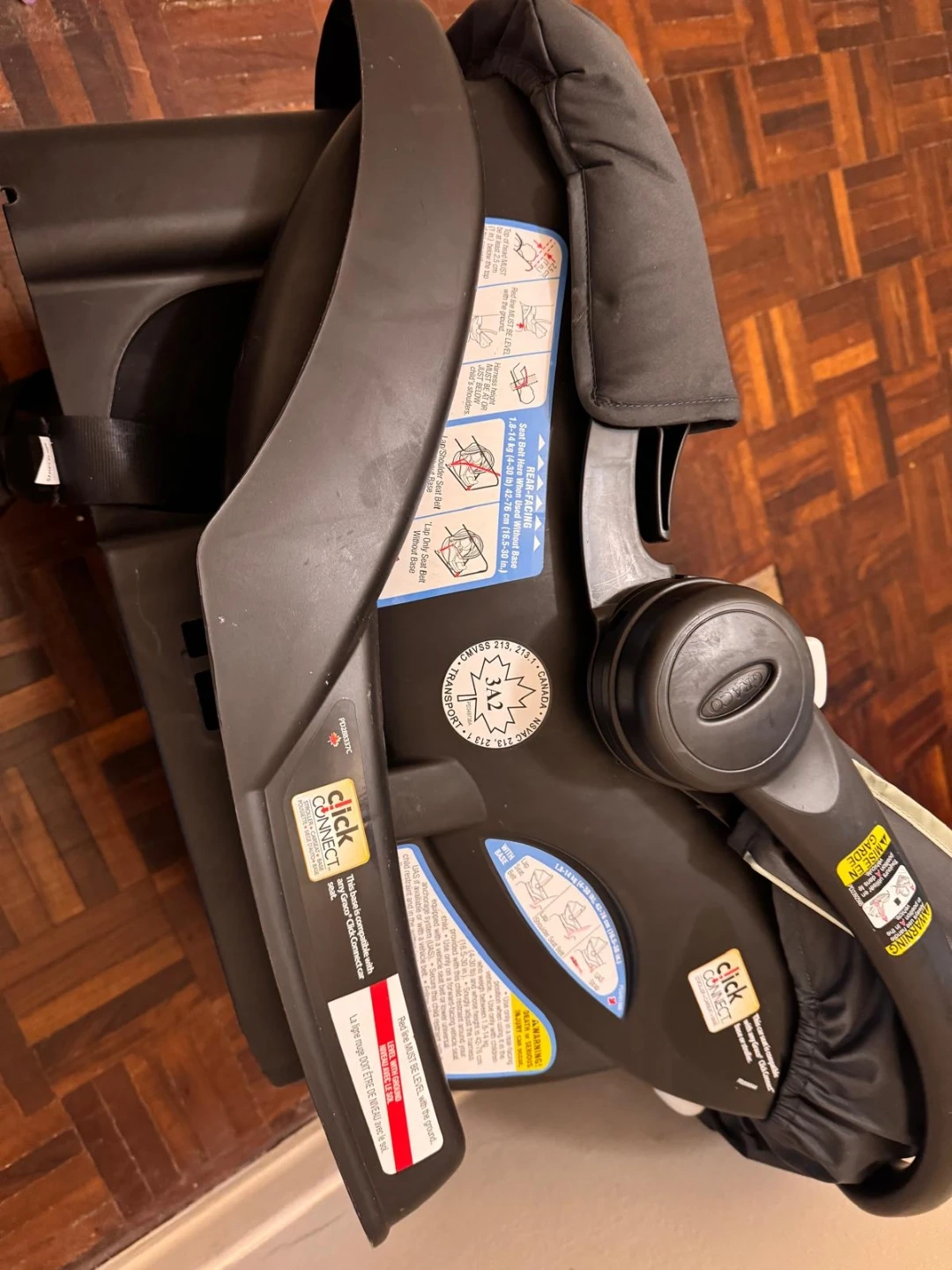 Graco SnugRide Click Connect infant car seat and base. This seat is rear-facing and supports children from 4-30 lbs. It's compatible with Graco strollers for easy travel. The harness height must be at or just below the child's shoulders.