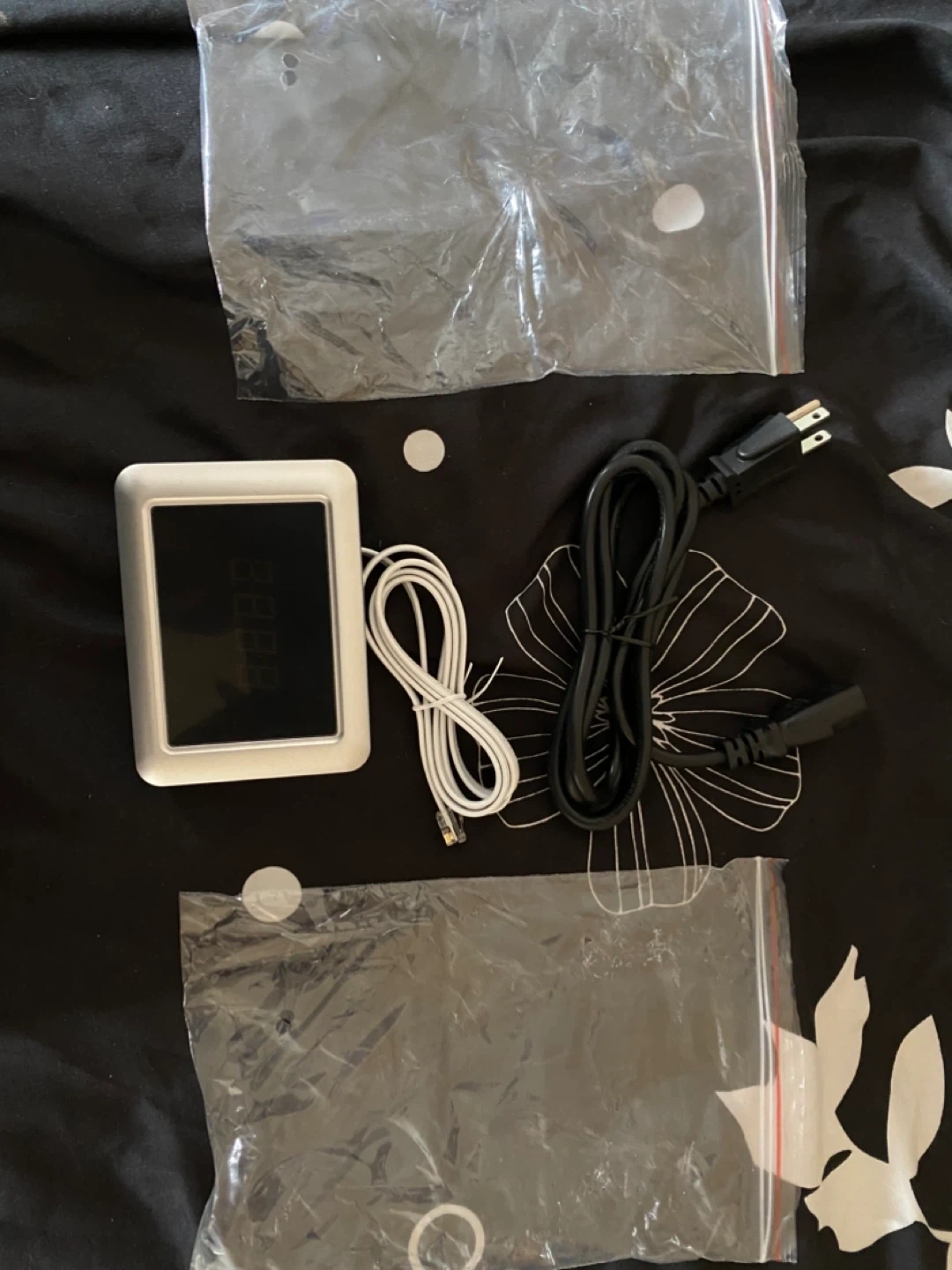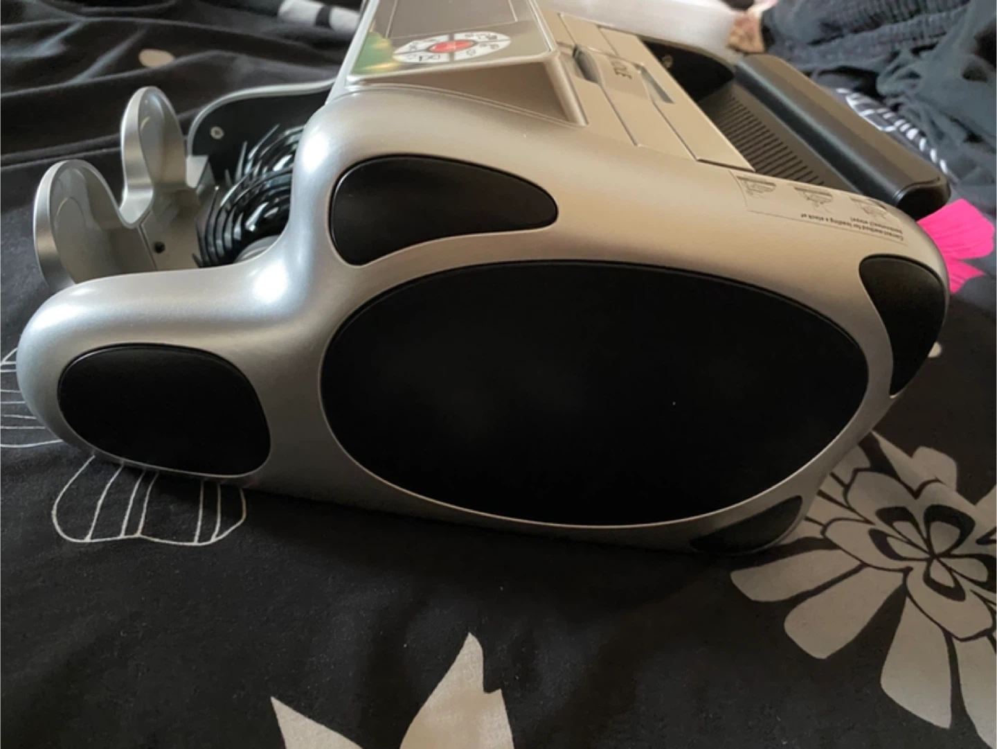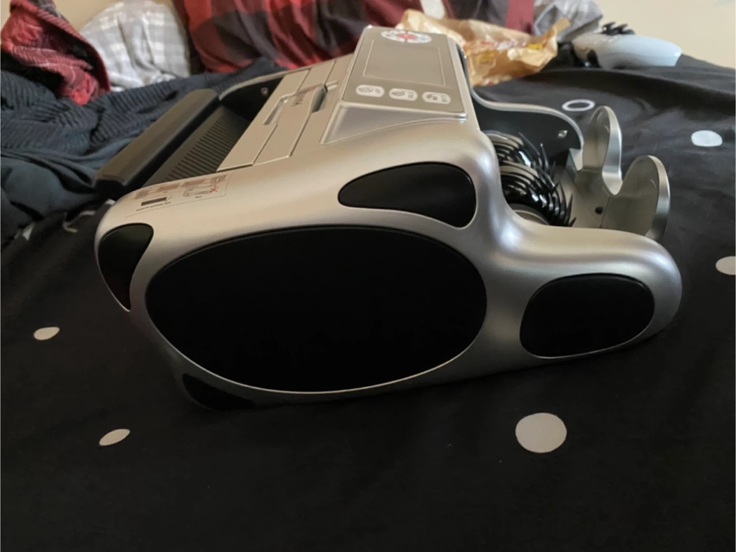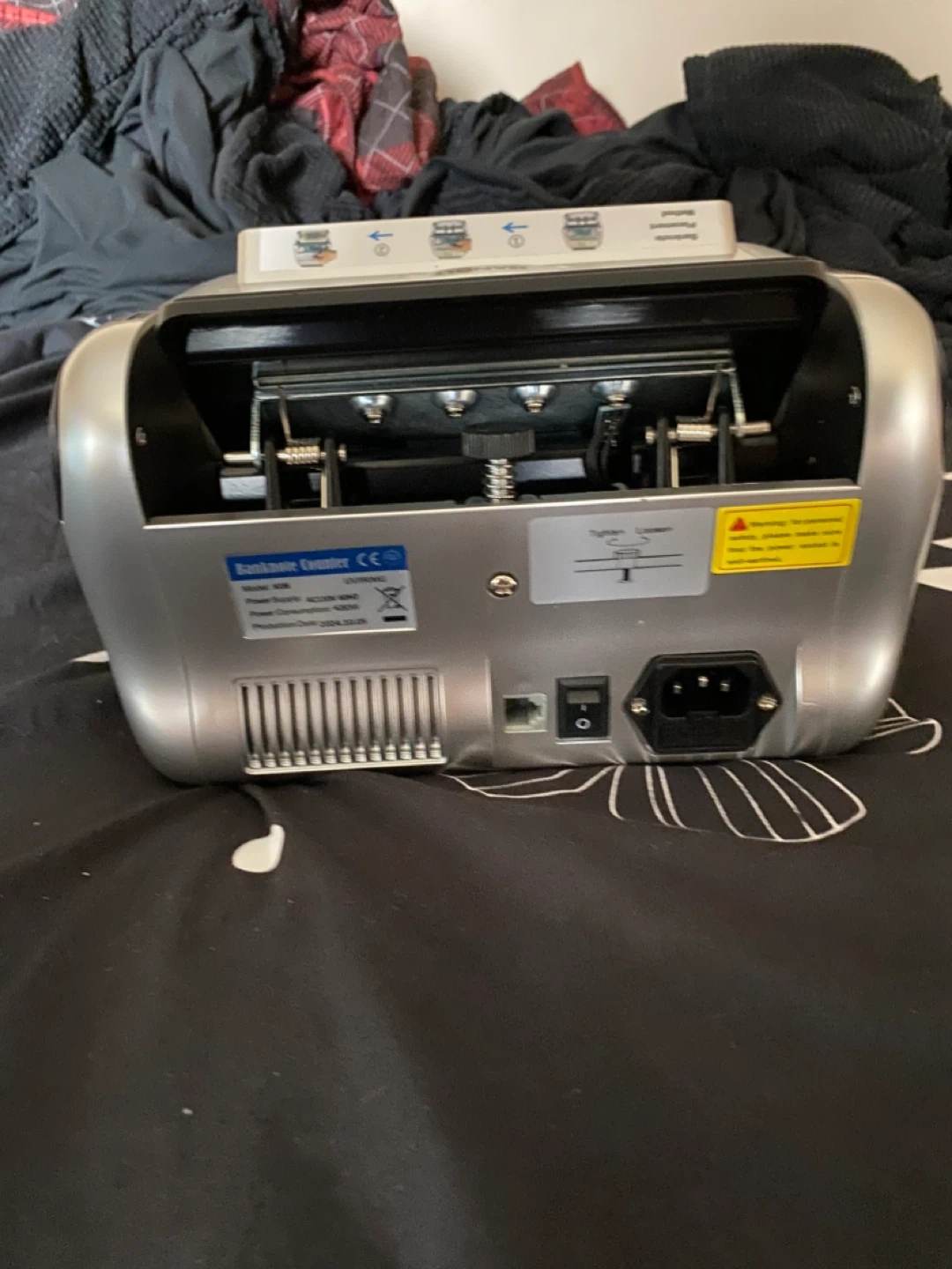 This is a bill counting machine. It's silver and comes with a brush and several stacks of play money in different denominations. It's great for practicing counting large sums or for use in games. Comes with the machine, brush, and fake money bills.