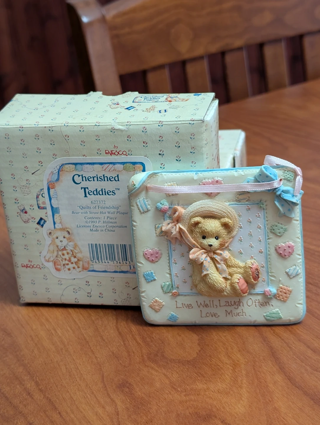 This Cherished Teddies wall plaque features a bear with a straw hat. It's titled "Quilts of Friendship". The plaque reads "Live Well, Laugh Often, Love. Much."