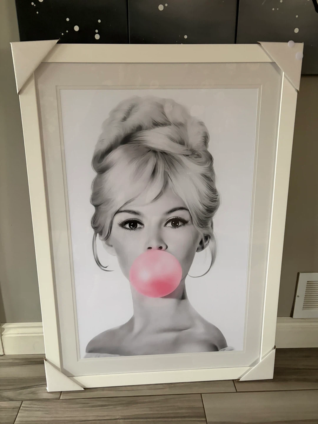 Framed black and white art print of a woman blowing a pink bubble gum. The frame is white and comes with protective corner guards. It's a stylish piece for any room!