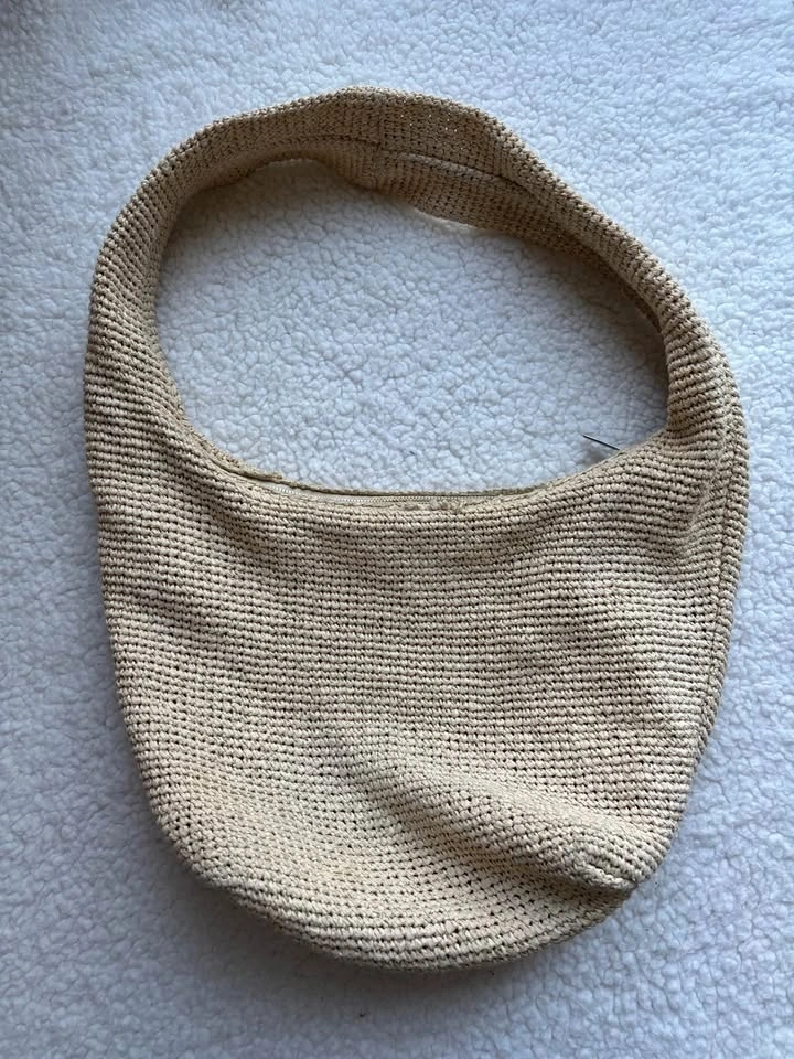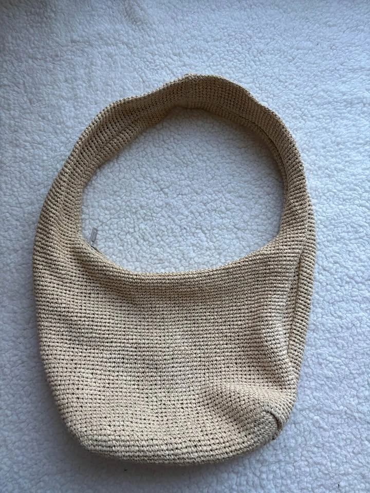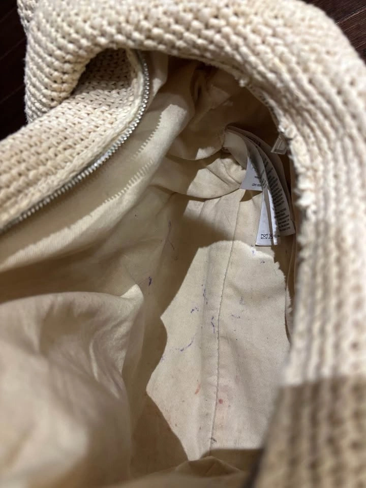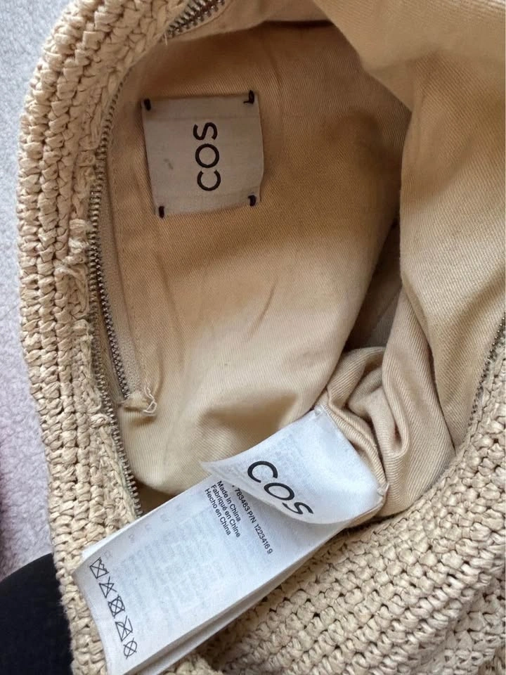 This Cos mini bag is crafted from natural raffia. It features silver-tone hardware and a zipped pocket inside. The bag measures 29.5cm in height, 23.5cm in width, and 11cm in depth. Lining is 50% Cotton, 50% Recycled Cotton. Protective covers are still on the zippers. There are some signs of wear along the zippers and pen marks/staining in the inside lining, as shown in the pictures and reflected in the price.