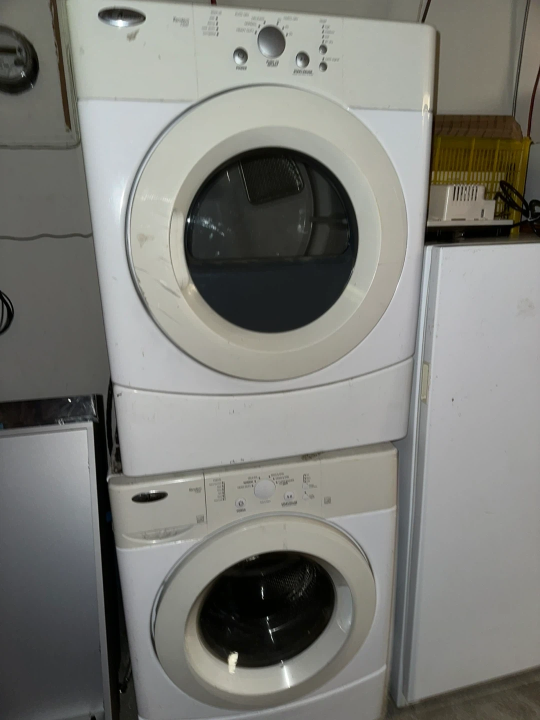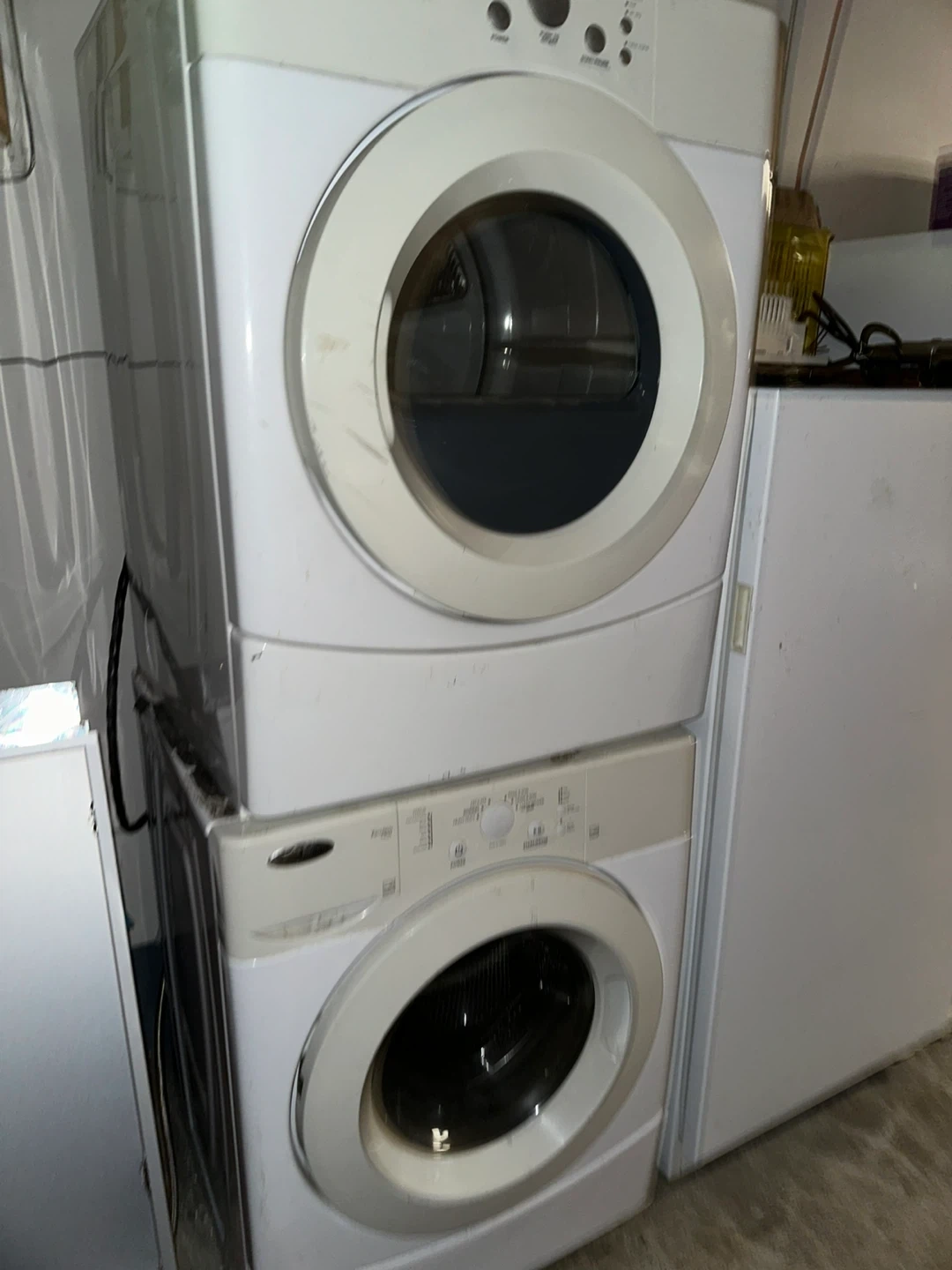 Selling a Whirlpool washer and dryer set. They are stacked, saving space, and ready to help with your laundry needs