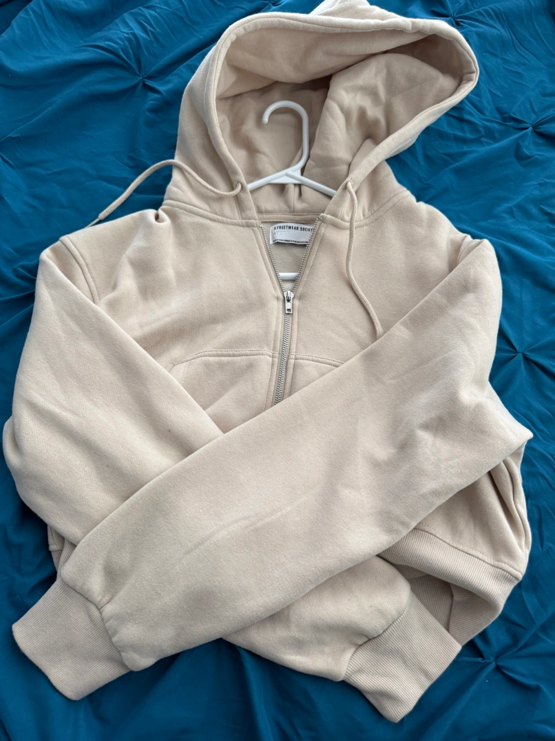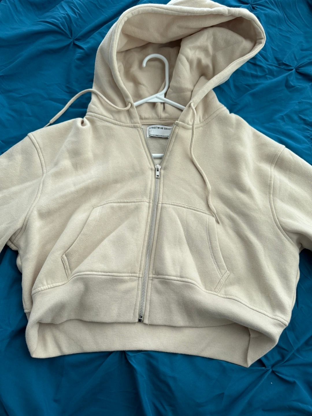 Cream coloured zip-up hoodie. Cropped style. Selling a bunch of brand new, never-worn clothes for just $5 each. Just trying to clear space and I've had this for over a year and never worn it. I haven’t even gone through everything yet, so more might be added soon, feel free to check my other listings!!