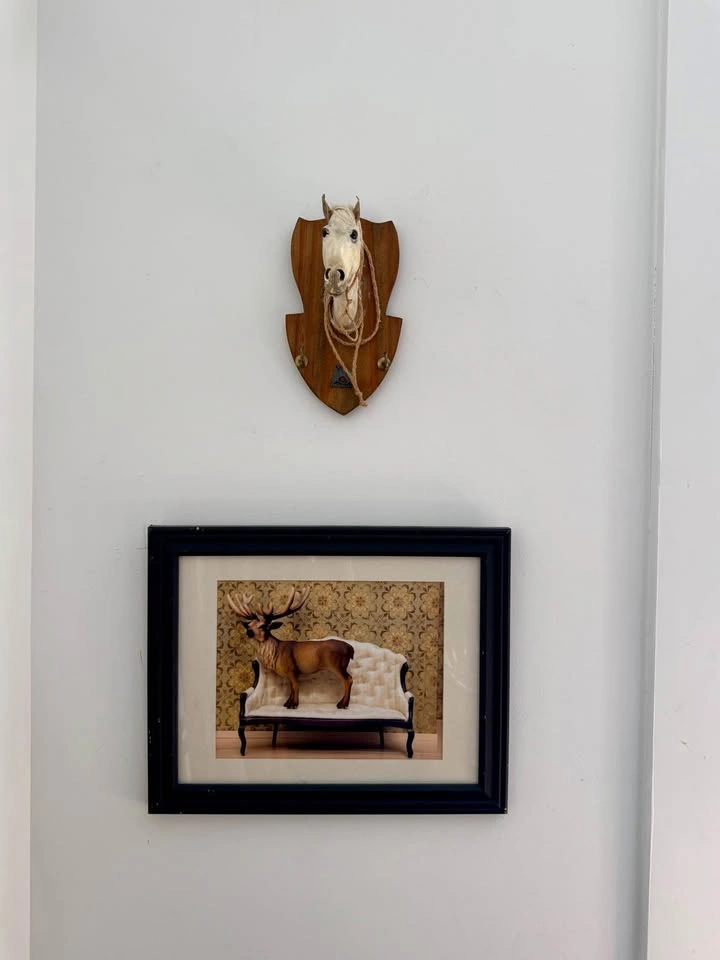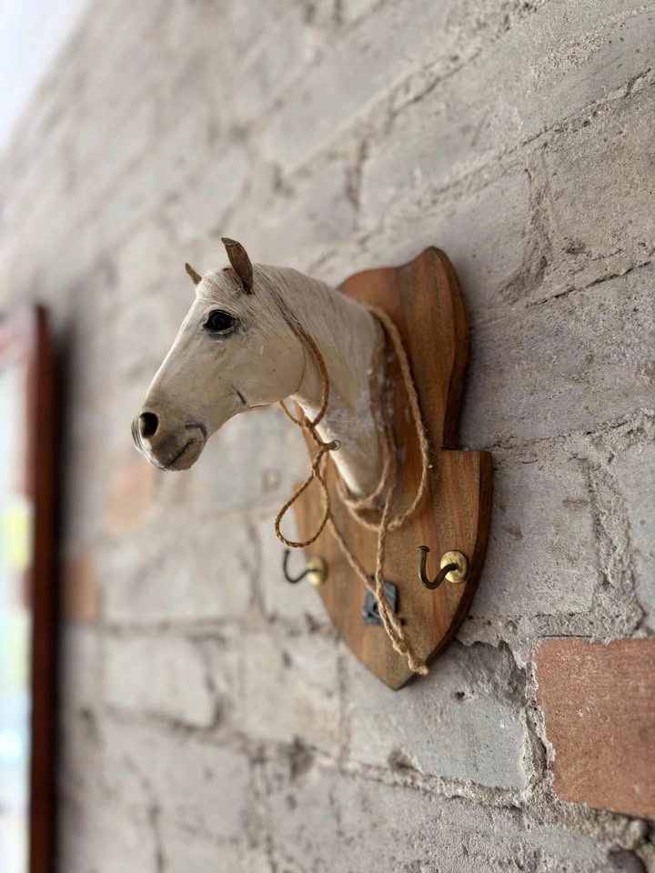 Rustic and charming vintage wall decor featuring a realistic white horse head bust mounted on a classic wood plaque. This is a great piece of faux taxidermy wall art! Perfect for your entryway, barn, tack room, or farmhouse kitchen! Includes two metal hooks for keys and light scarfs. Great gift for a horse lover!