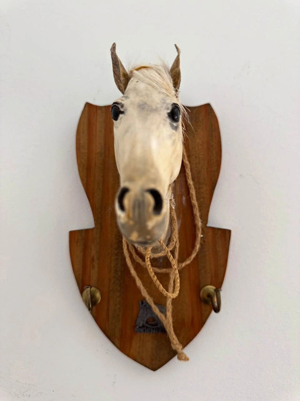 Rustic and charming vintage wall decor featuring a realistic white horse head bust mounted on a classic wood plaque. This is a great piece of faux taxidermy wall art! Perfect for your entryway, barn, tack room, or farmhouse kitchen! Includes two metal hooks for keys and light scarfs. Great gift for a horse lover!