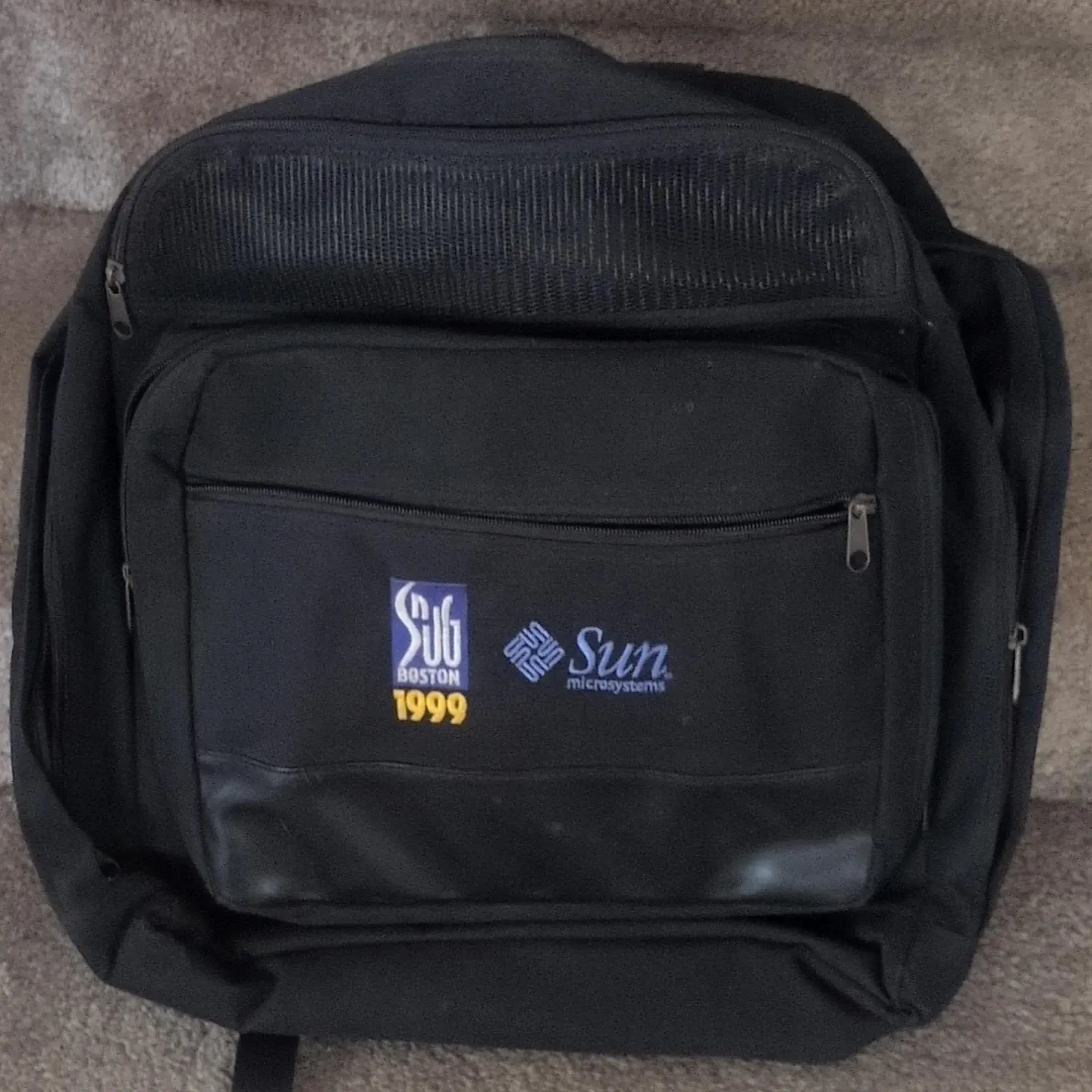 This black backpack features the Sun Microsystems logo and 'Boston 1999' text. It has multiple zippered compartments and a mesh section at the top. It's a durable bag for carrying essentials.