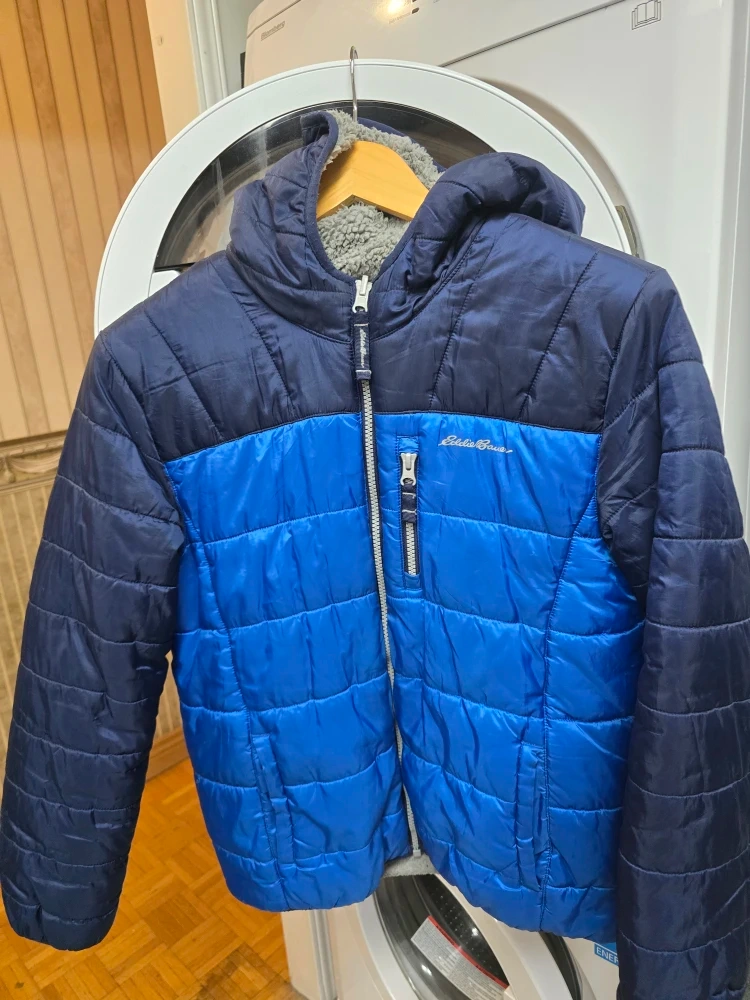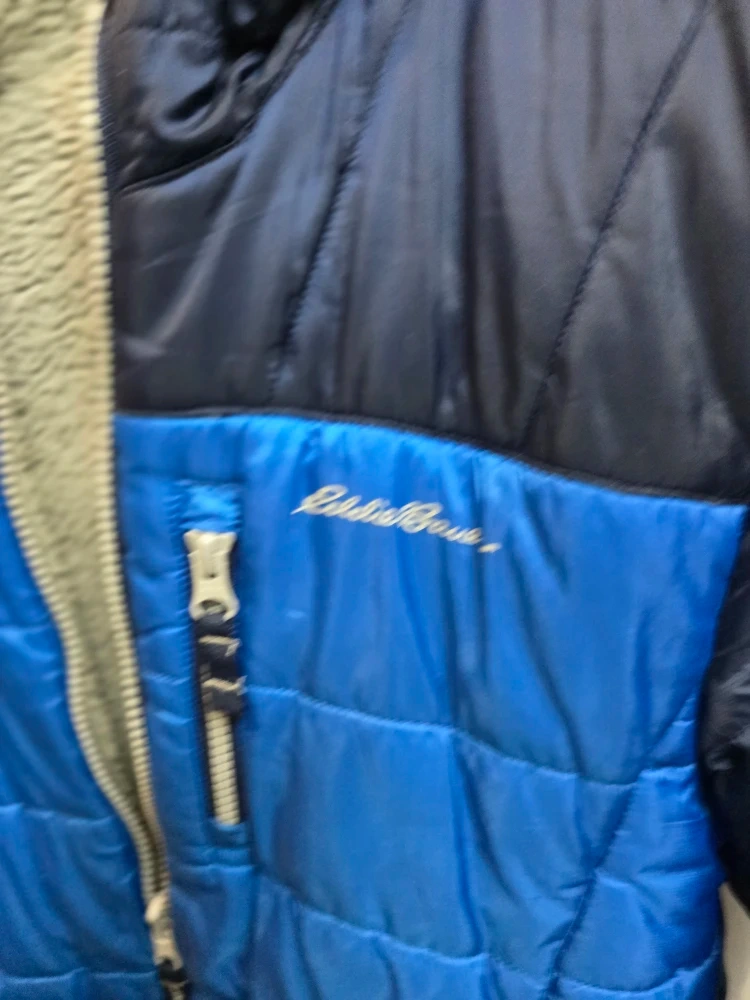 Selling an Eddie Bauer puffer jacket in size XL (14/16). It's in great condition and perfect for keeping warm during the colder months! The jacket features a stylish two-tone design with a navy blue upper and a bright blue lower section. It also has a hood for extra protection from the elements