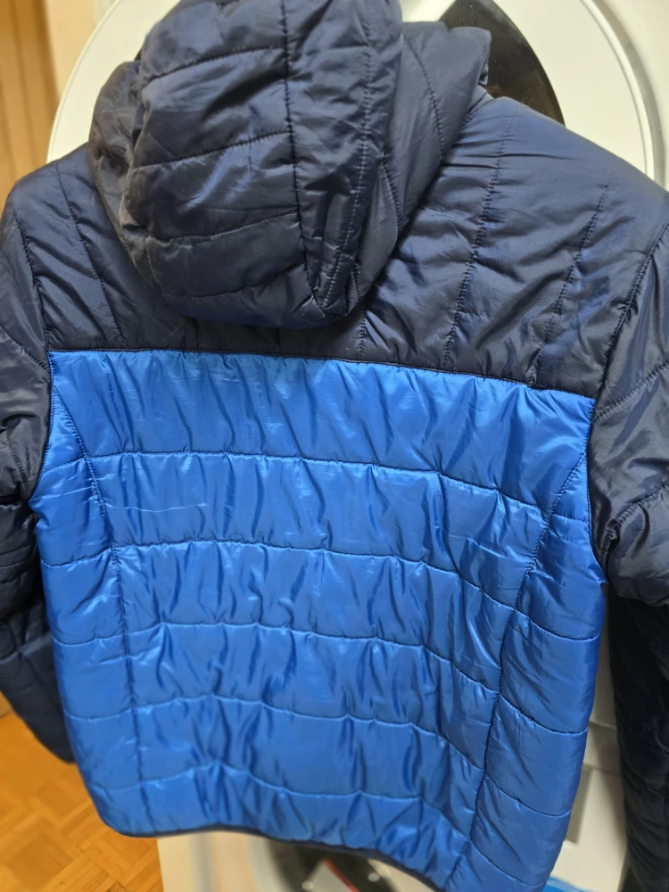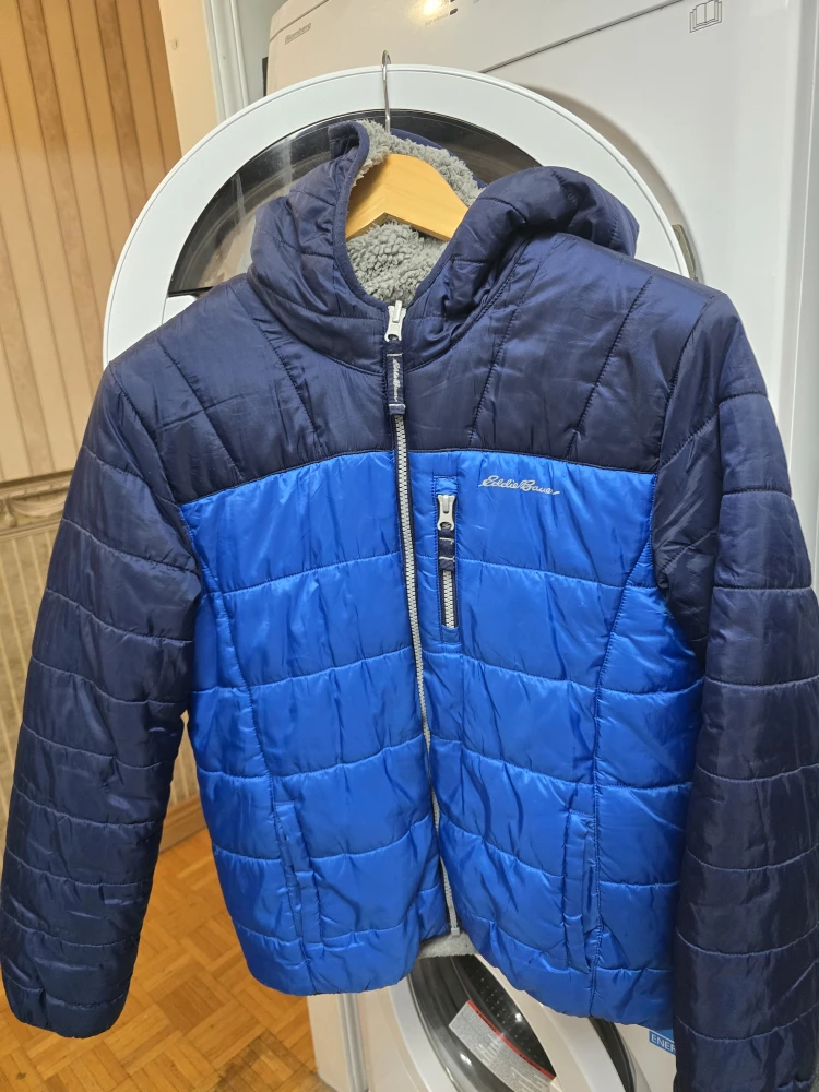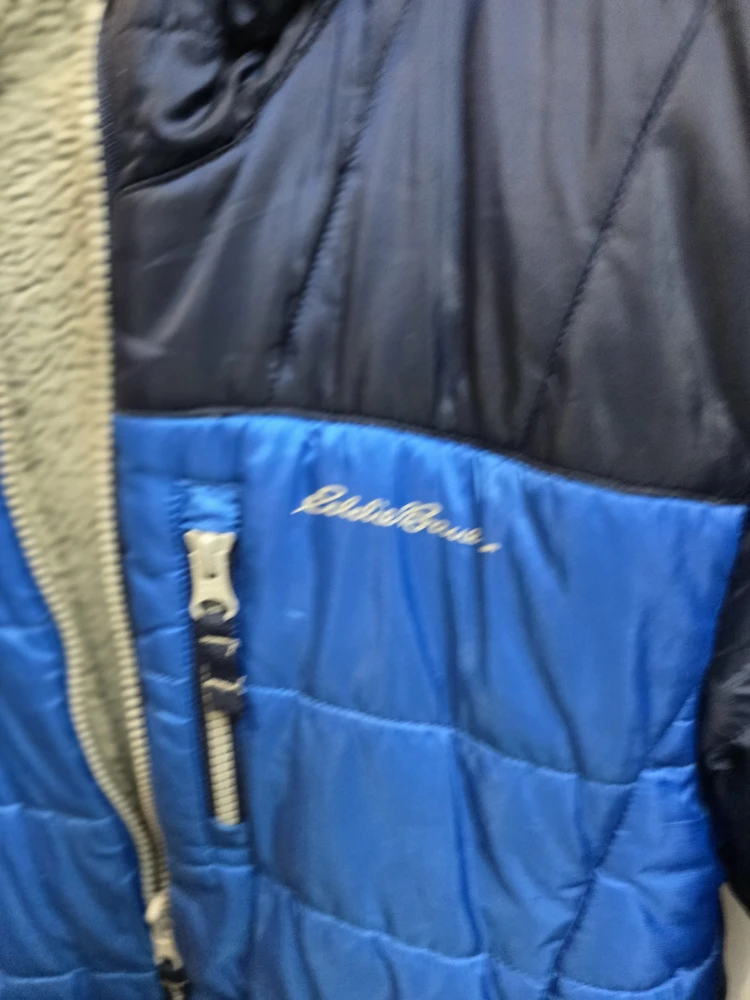 Selling an Eddie Bauer puffer jacket in size XL (14/16). It's in great condition and perfect for keeping warm during the colder months! The jacket features a stylish two-tone design with a navy blue upper and a bright blue lower section. It also has a hood for extra protection from the elements