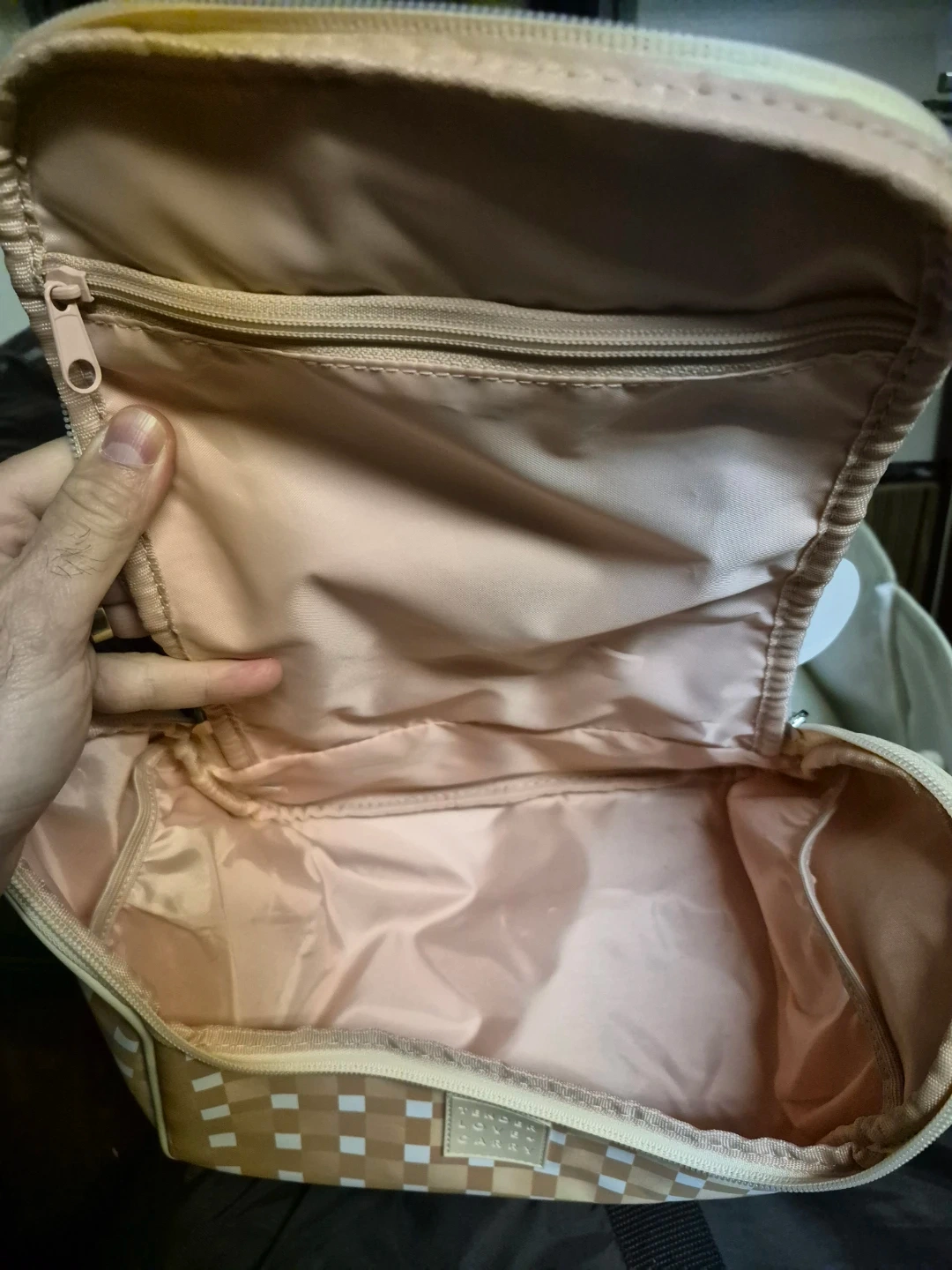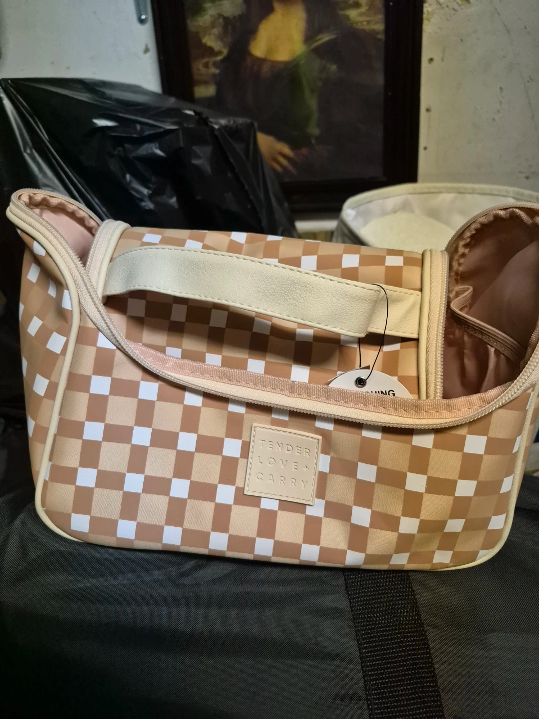 This Tender Love + Carry cosmetic bag has a checkered pattern. It's perfect for storing makeup and toiletries. Includes multiple compartments inside for organization.