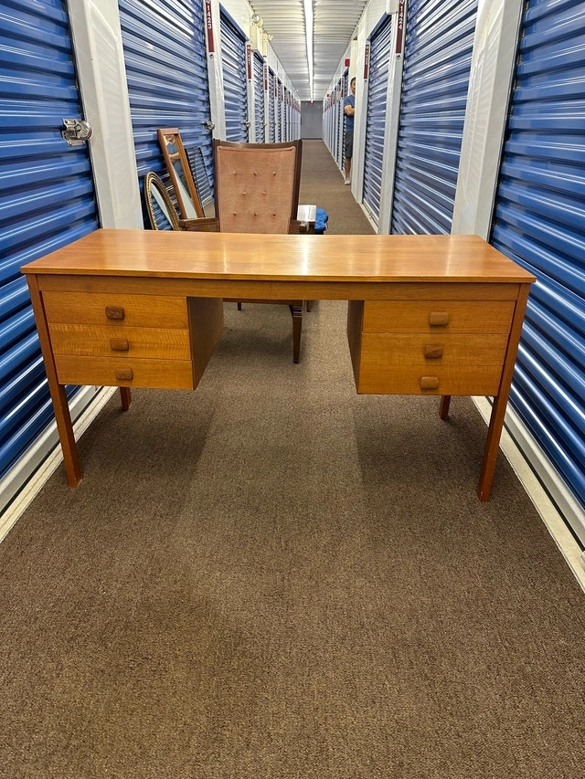 This is a vintage teak desk, made in Denmark, featuring a beautiful wood grain and ample storage with drawers on either side, perfect for a home office or study. This desk has signs of use and is in good condition. It's a piece that combines functionality with mid-century modern aesthetics. Material: Teak wood, Style: Mid-Century Modern, Origin: Denmark, Features: Drawers on both sides.