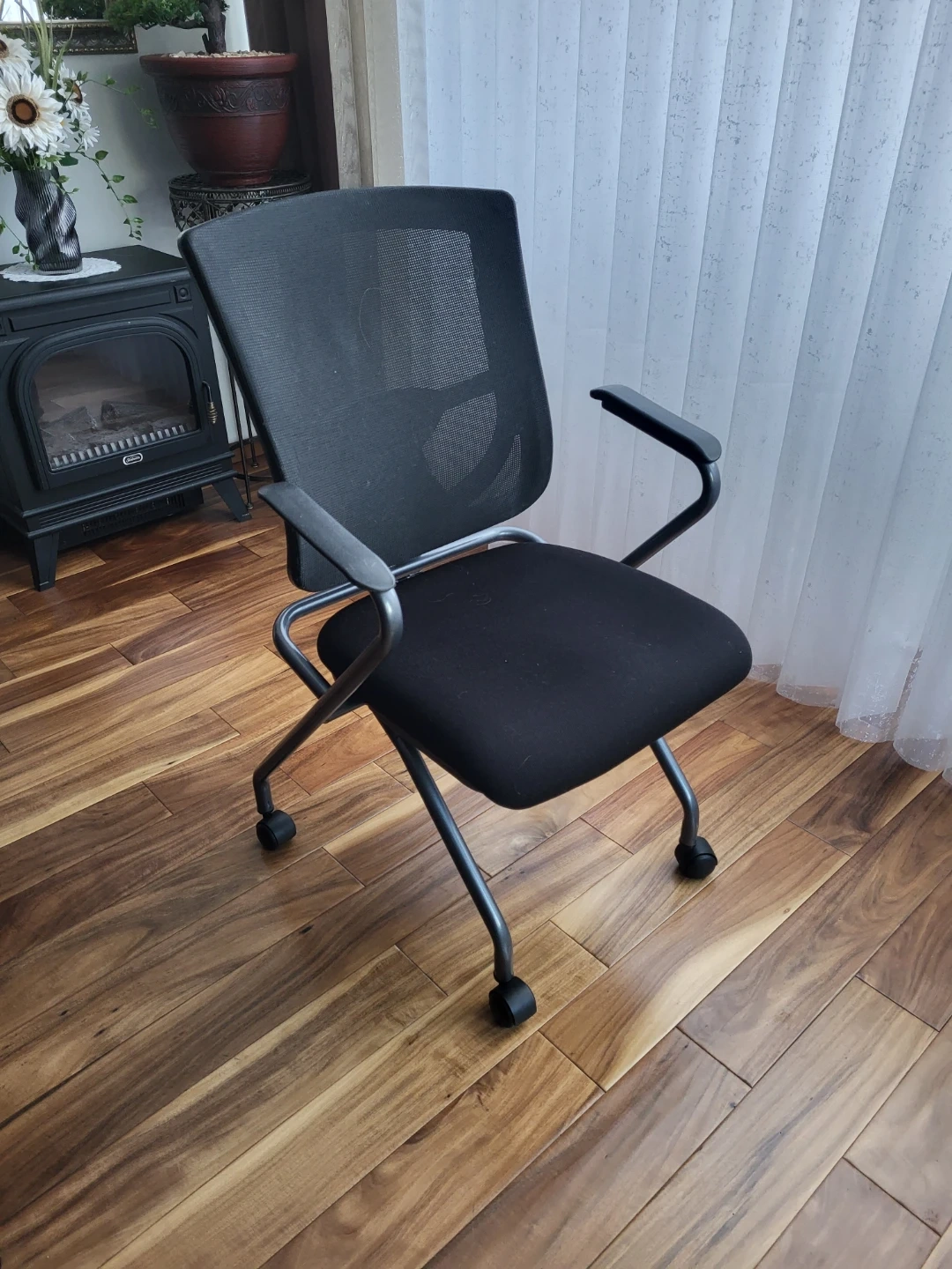 This black office chair features a breathable mesh back and a padded seat. It's equipped with rolling casters for easy mobility. The armrests offer a bit of extra support.