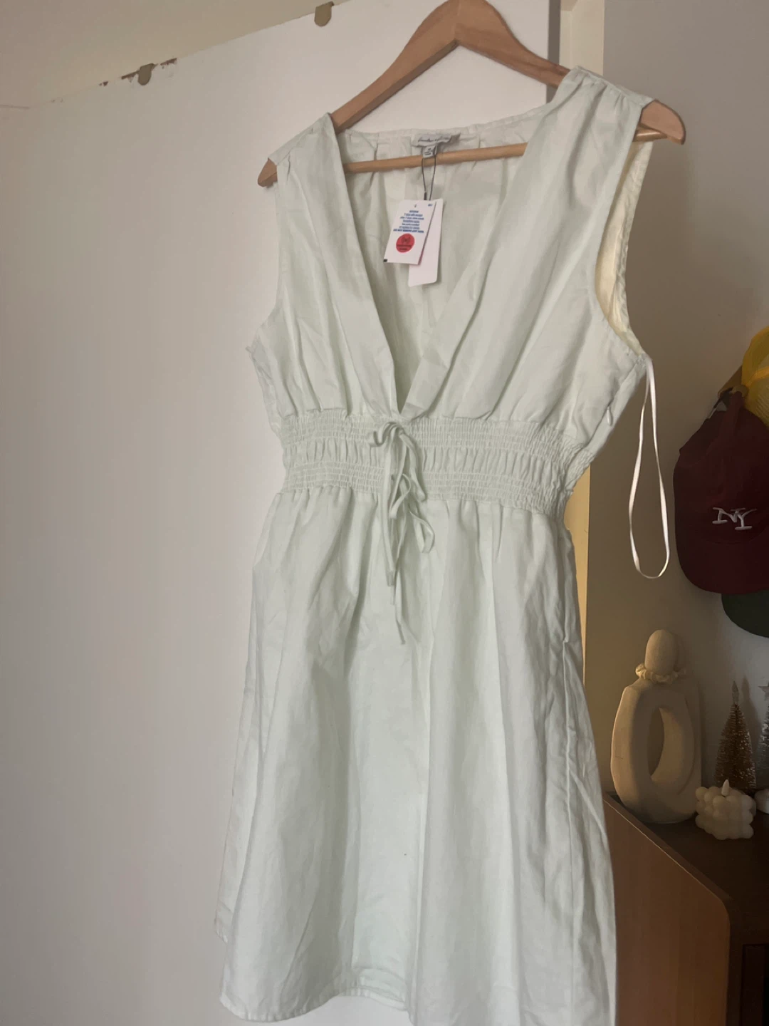 Lightweight V-neck dress with a smocked elastic waist and adjustable drawstring. Sleeveless design with a knee-length hem. It's made of a breathable fabric, 100% cotton and perfect for warm weather.