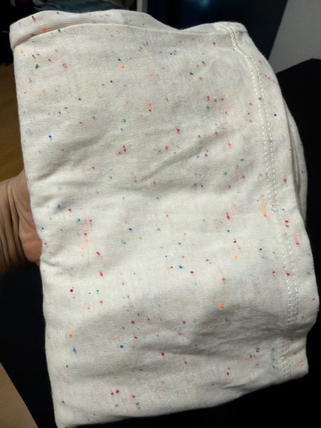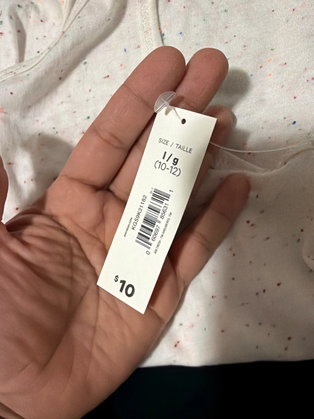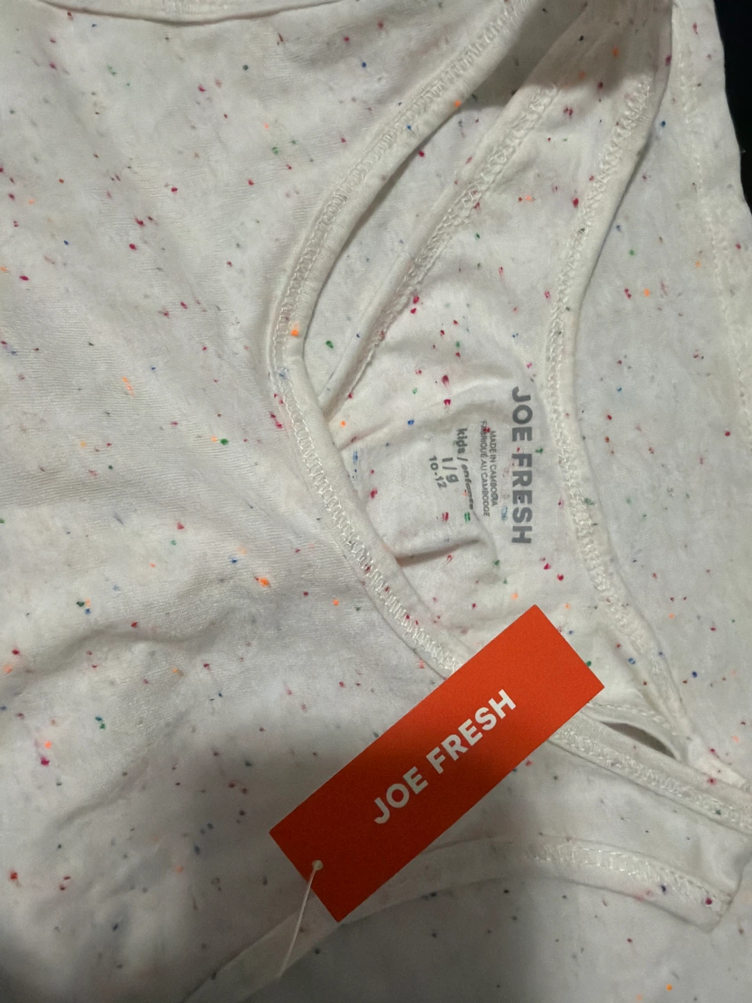 This Joe Fresh tank top is white with a fun multicoloured speckle pattern. It's size large, fitting kids' sizes 10-12. Made with a comfortable fabric blend.