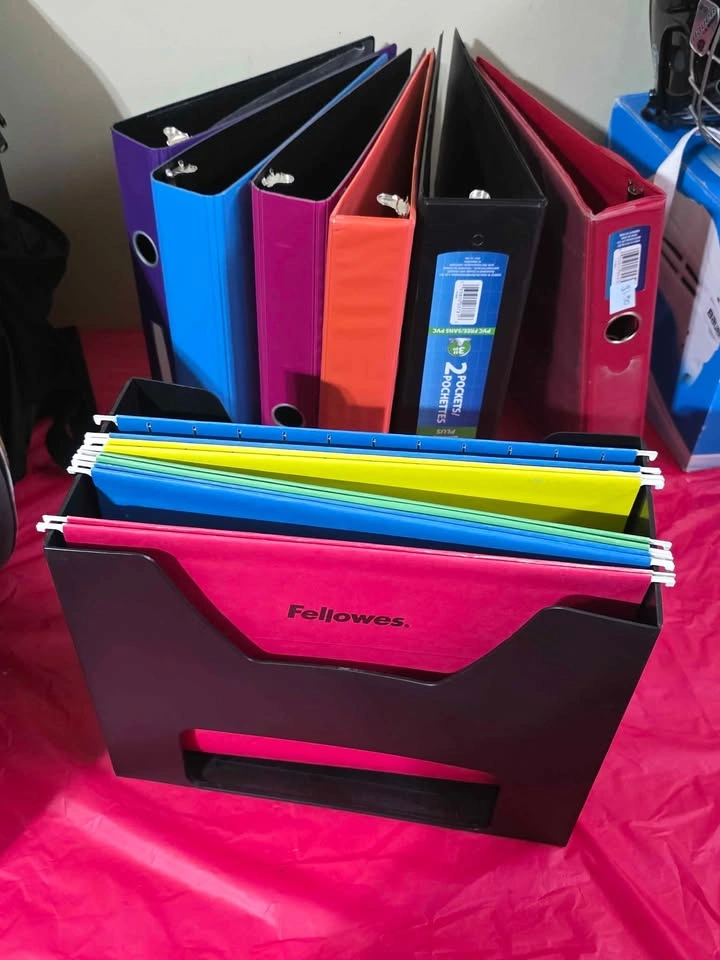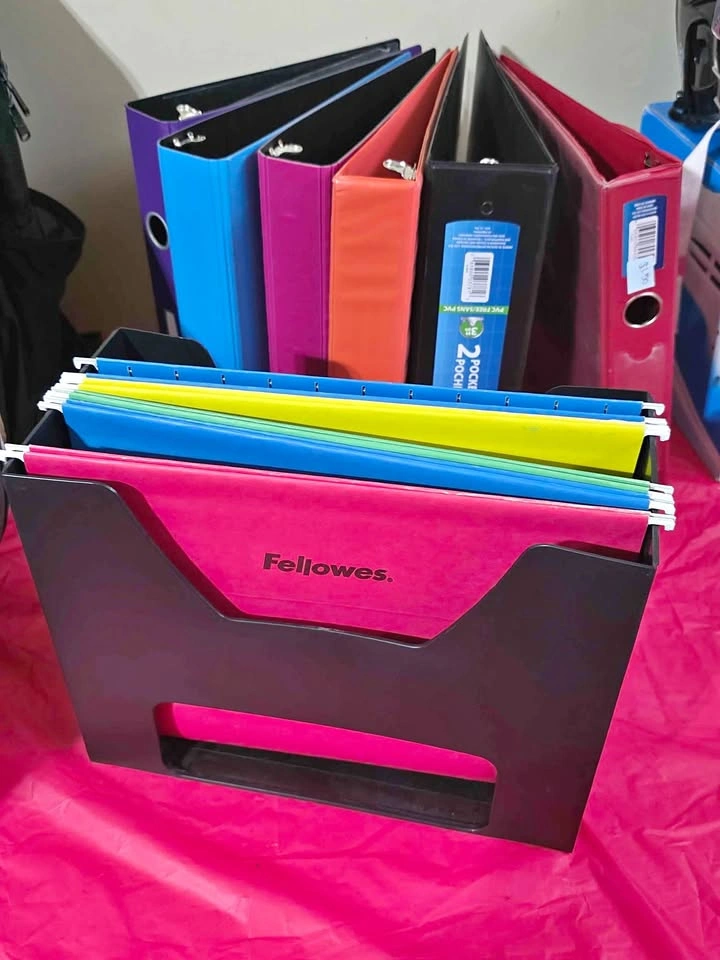 New beautiful binders all different colors and sizes, can hold large amounts of papers and books in them each for 2 dollars. The paper organizer is for 10 dollars and helps you stay organized with all your papers in each different compartment. The vibrant colors will look perfect in any room and aesthetic!