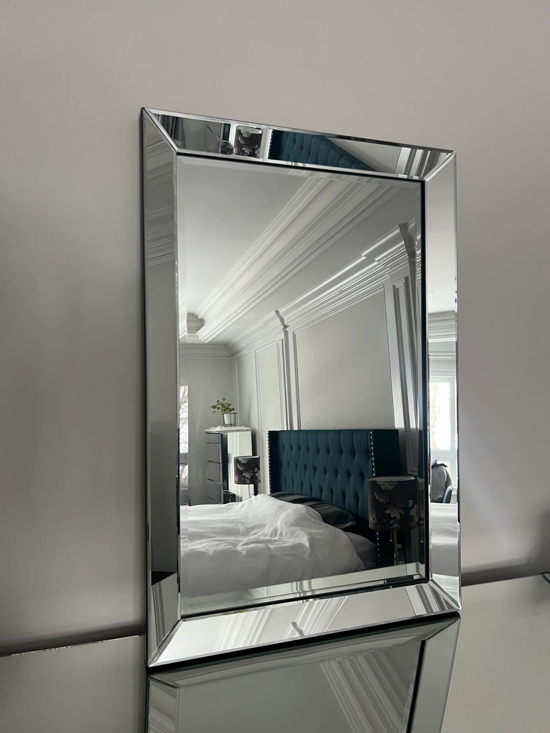 A beautiful rectangular wall mirror with a bevelled edge design. It's constructed with mirrored glass and has a classic Venetian style. This mirror is perfect for adding a touch of elegance to any room. It can be mounted on a wall for a decorative and functional piece.