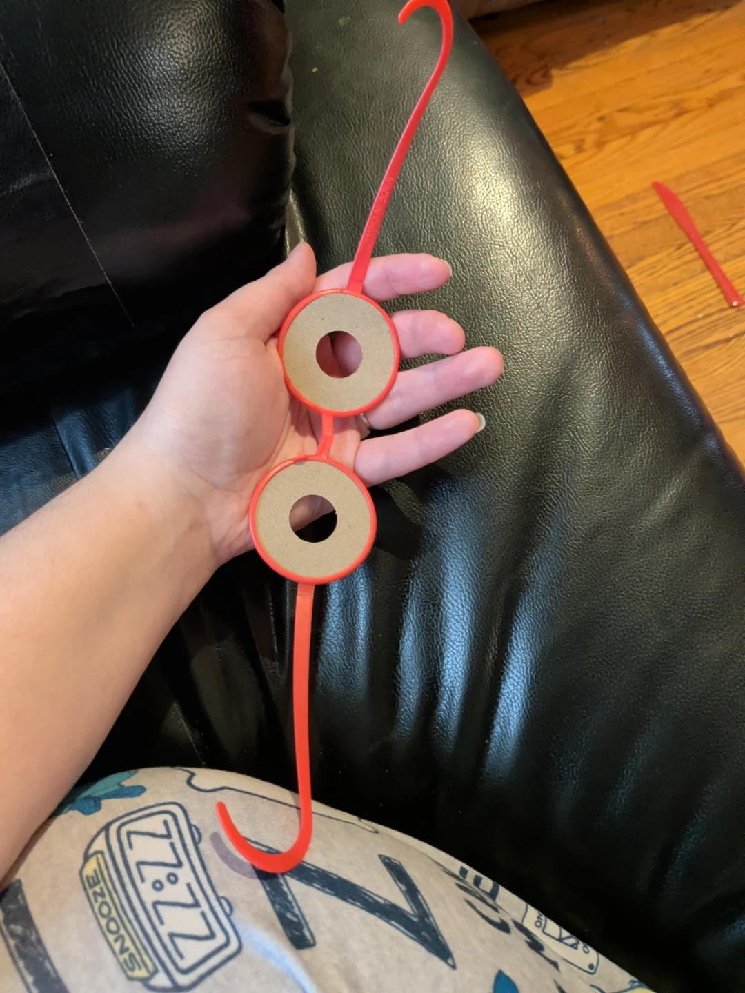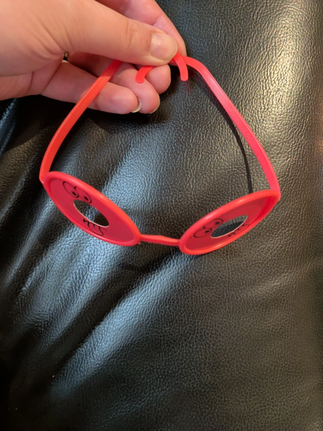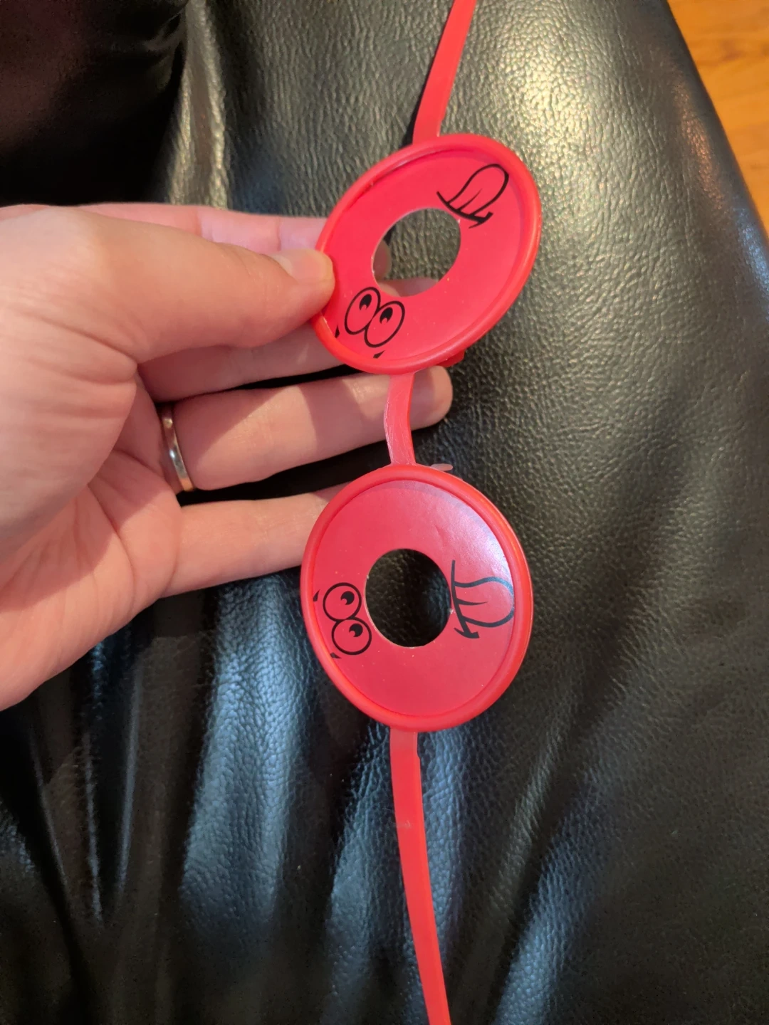 This red plastic string holds two pairs of novelty googly eye glasses. It's great for parties or as a fun accessory. The string is designed to keep your glasses secure and easily accessible.
