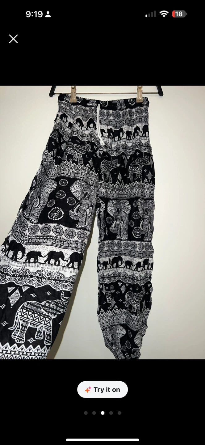 These black and white harem pants feature a fun elephant print with an elastic waistband. They offer a comfortable and loose-fitting style. Great for casual wear or lounging!