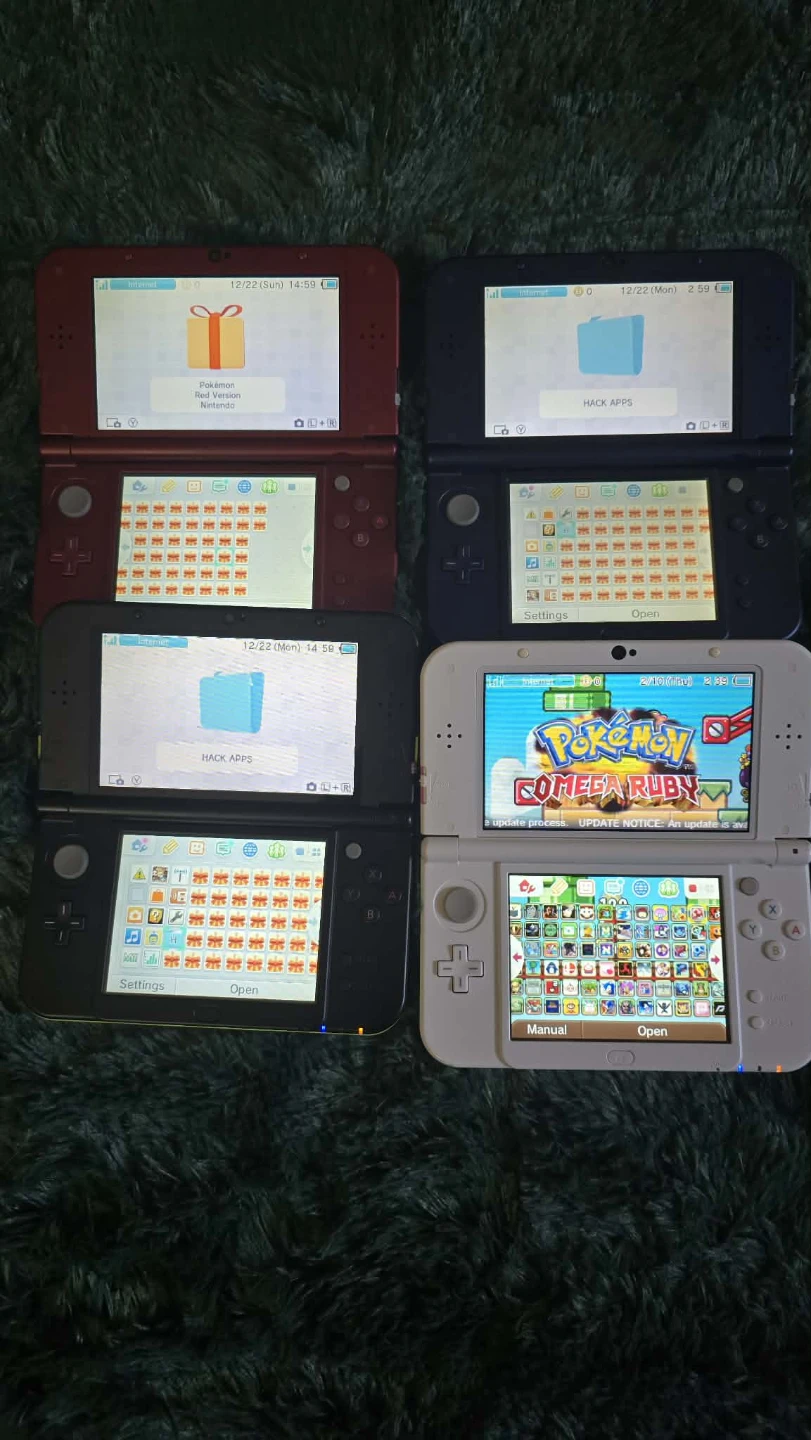 four Nintendo 3DS XL consoles in red, blue, black, and white. These handheld gaming systems are great for on-the-go entertainment! They all power on.
