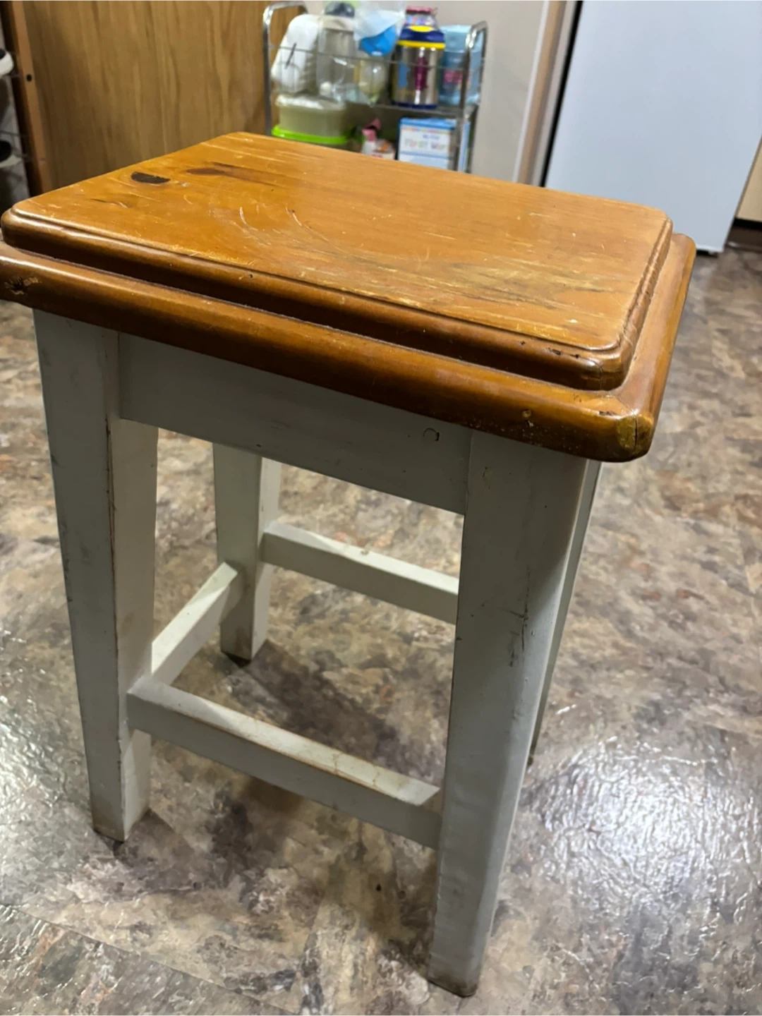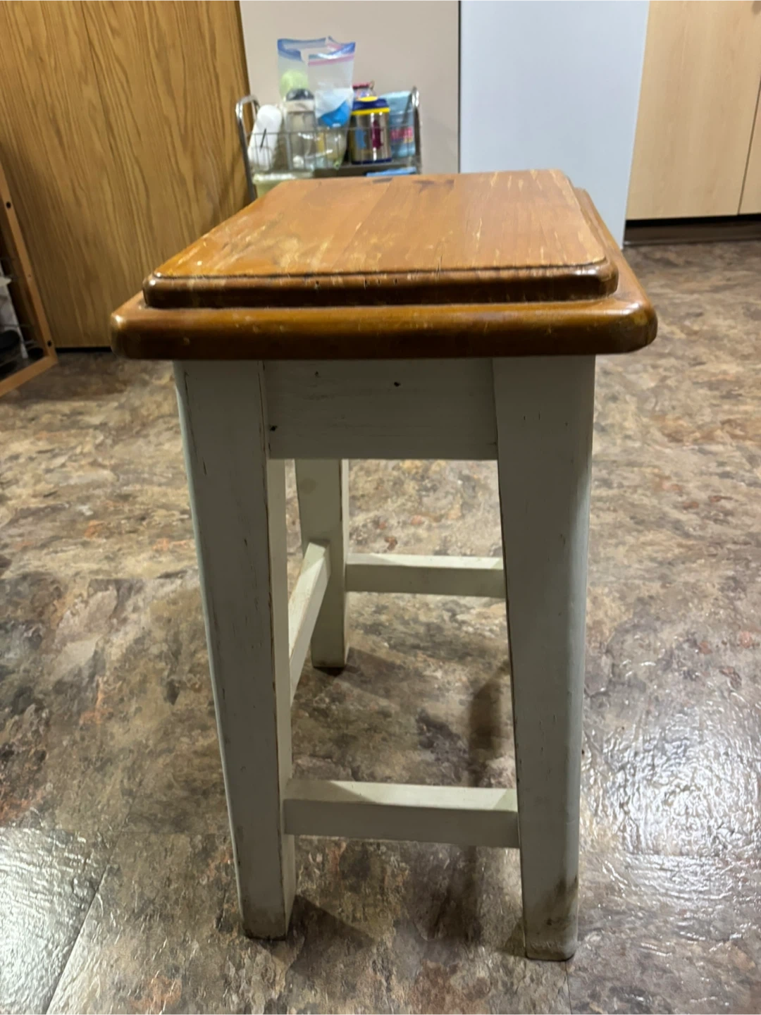 This is a sturdy wooden bar stool with a natural wood seat and a white base. It's perfect for a kitchen counter or bar area. Measures 60 cm tall 30 x 40 cm wide