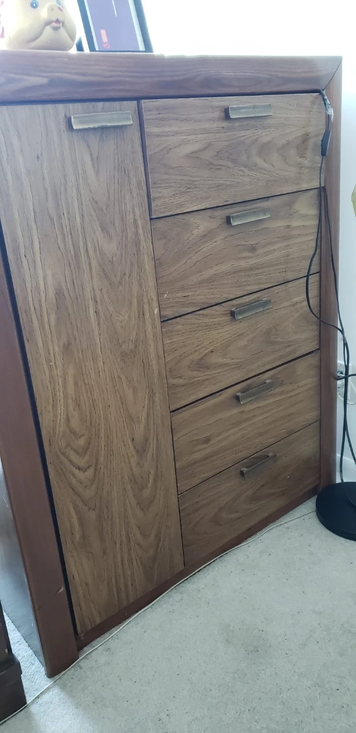 A solid wood dresser featuring one cabinet door and five drawers for storage. The wood grain finish adds a natural touch. Its versatile design suits various room decors. Drawer and door handles are a brushed metal.