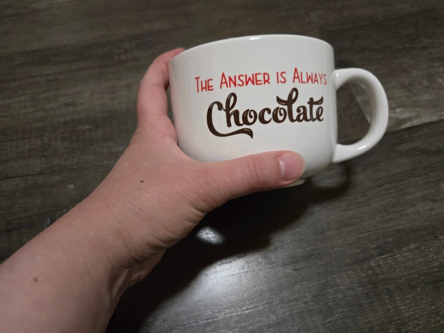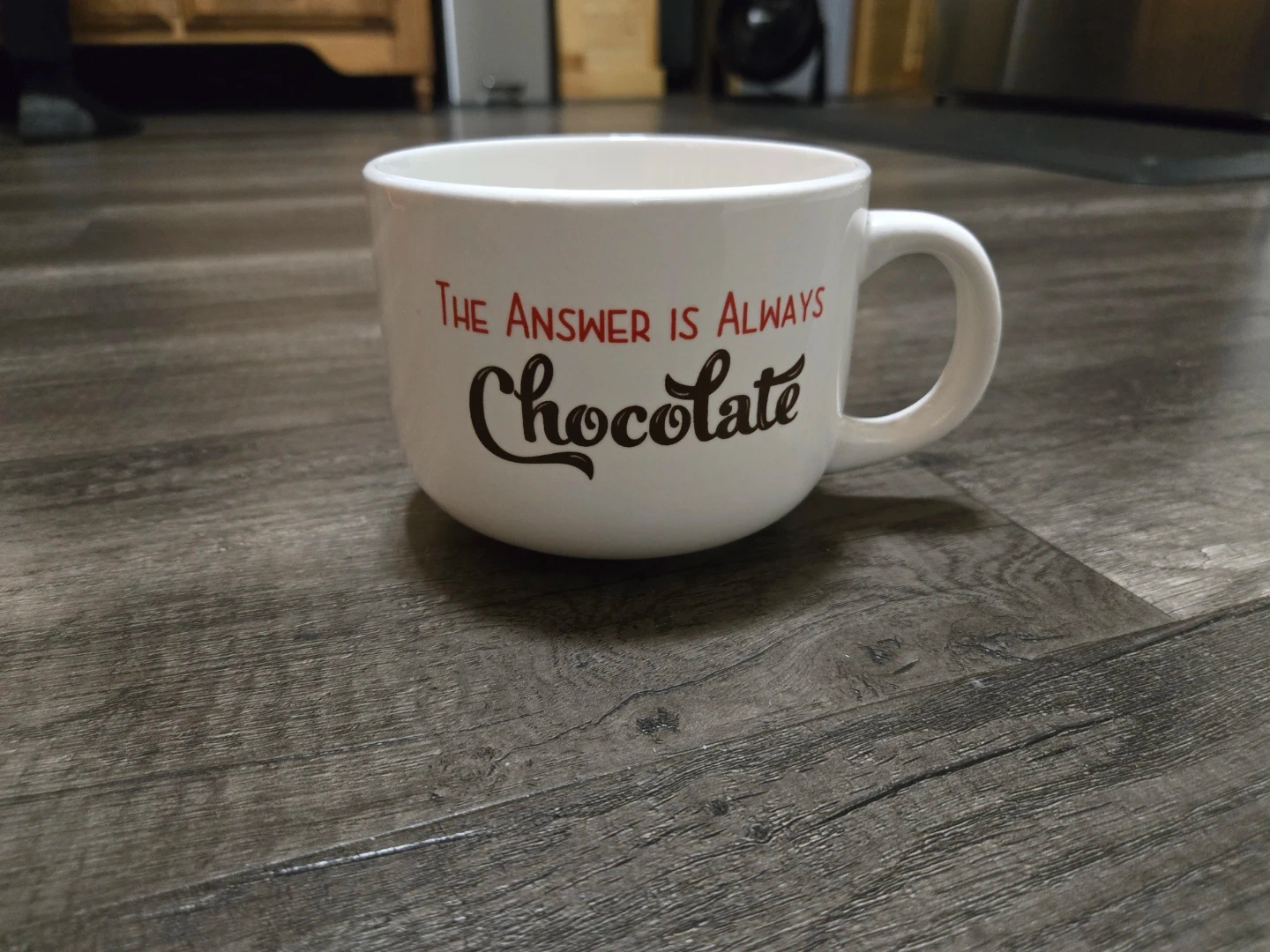 Buy & SellWhite "The Answer Is Always Chocolate" MugWhite "The Answer Is Always Chocolate" Mug$4This is a white ceramic mug. It says "The Answer Is Always Chocolate" in red and brown lettering. It's a good size for a hot beverage!ConditionNewWHERE TO MEETlittle house trailerView MapSELLERverifiedAndyStaples650 reviews0 chats·0 favorites·2 viewsSEND CHAT TO SELLERHi Andy! I’m interested in your listing.Hi Andy! I’m interested in your listing.Get the Karrot app to chatSign In to chat
