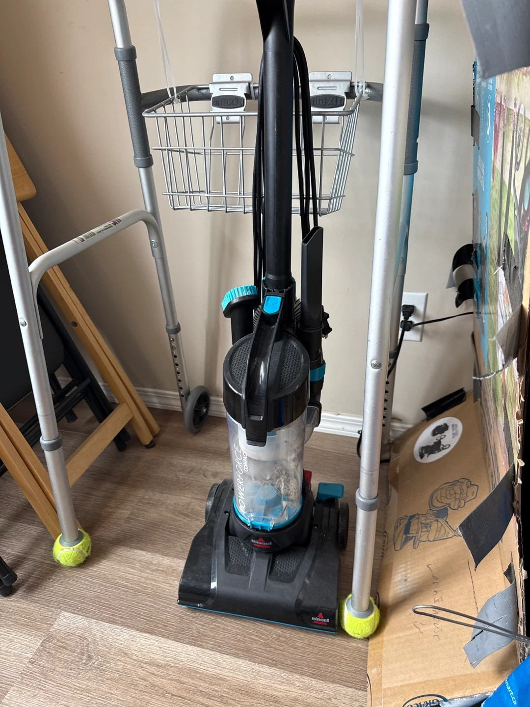 This Bissell Powerforce Compact vacuum cleaner is black and blue. It's a bagless upright model with a clear dirt tank. It's great for everyday cleanups around the house!