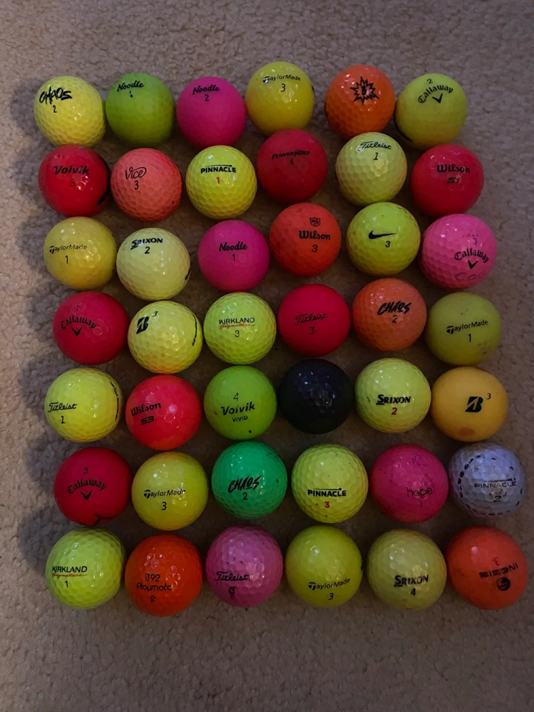 A collection of 42 coloured golf balls from various brands including Titleist, Callaway, Srixon, Wilson, Noodle, Vice, Volvik, Pinnacle, TaylorMade, Chaos, and Kirkland. Includes balls in different colours and a few with unique markings. Great for practice or casual rounds!