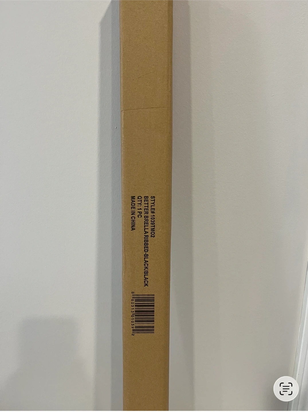 A black ribbed umbrella from Betterfit. It's a sturdy umbrella designed for rainy days. Includes original box.