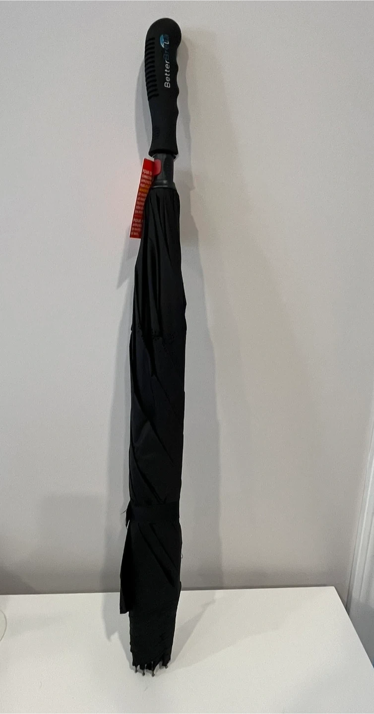 A black ribbed umbrella from Betterfit. It's a sturdy umbrella designed for rainy days. Includes original box.