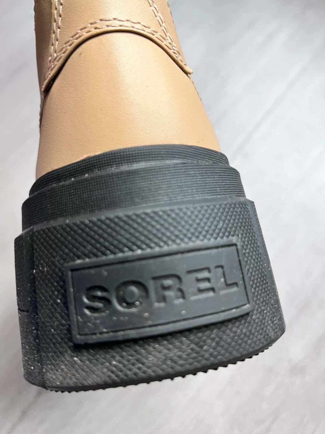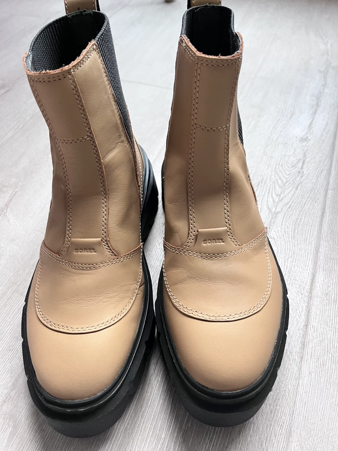 Size 7 . These Sorel boots are crafted from tan leather with elastic side panels for easy wear. They feature a durable black lug sole for great traction. Perfect for fall and winter weather!