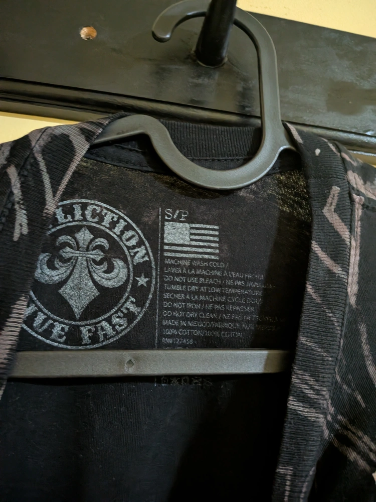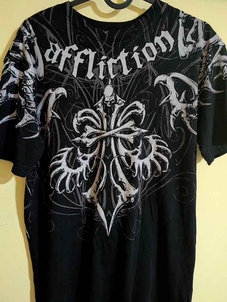 Selling a black Affliction t-shirt in size small. It has a really cool graphic design on both the front and back. The material is 100% cotton. Barely worn.