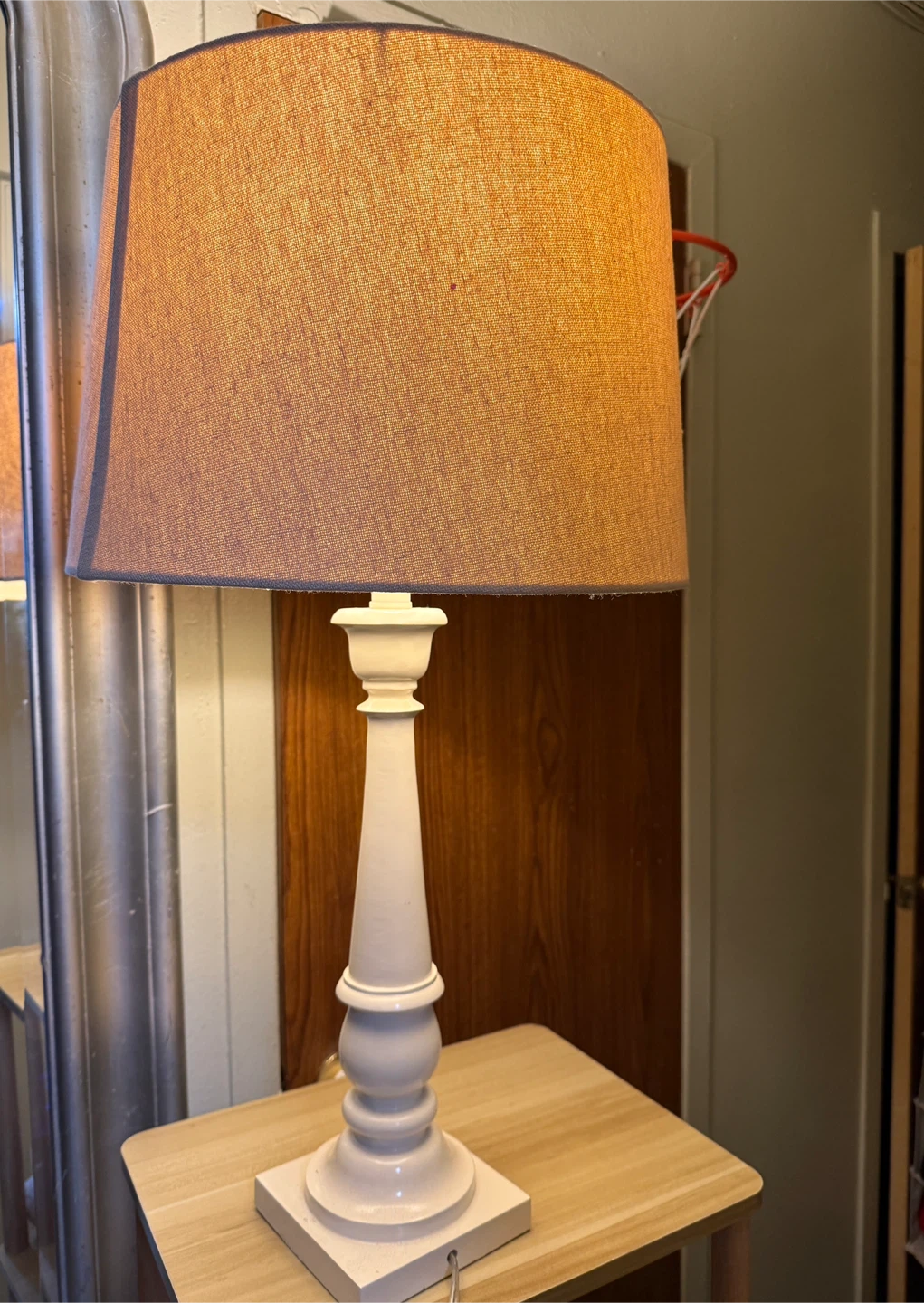 Selling a nice table wood lamp! It has a beige shade and a classic design that would look great in any room. It's in good condition and provides a warm, ambient light.