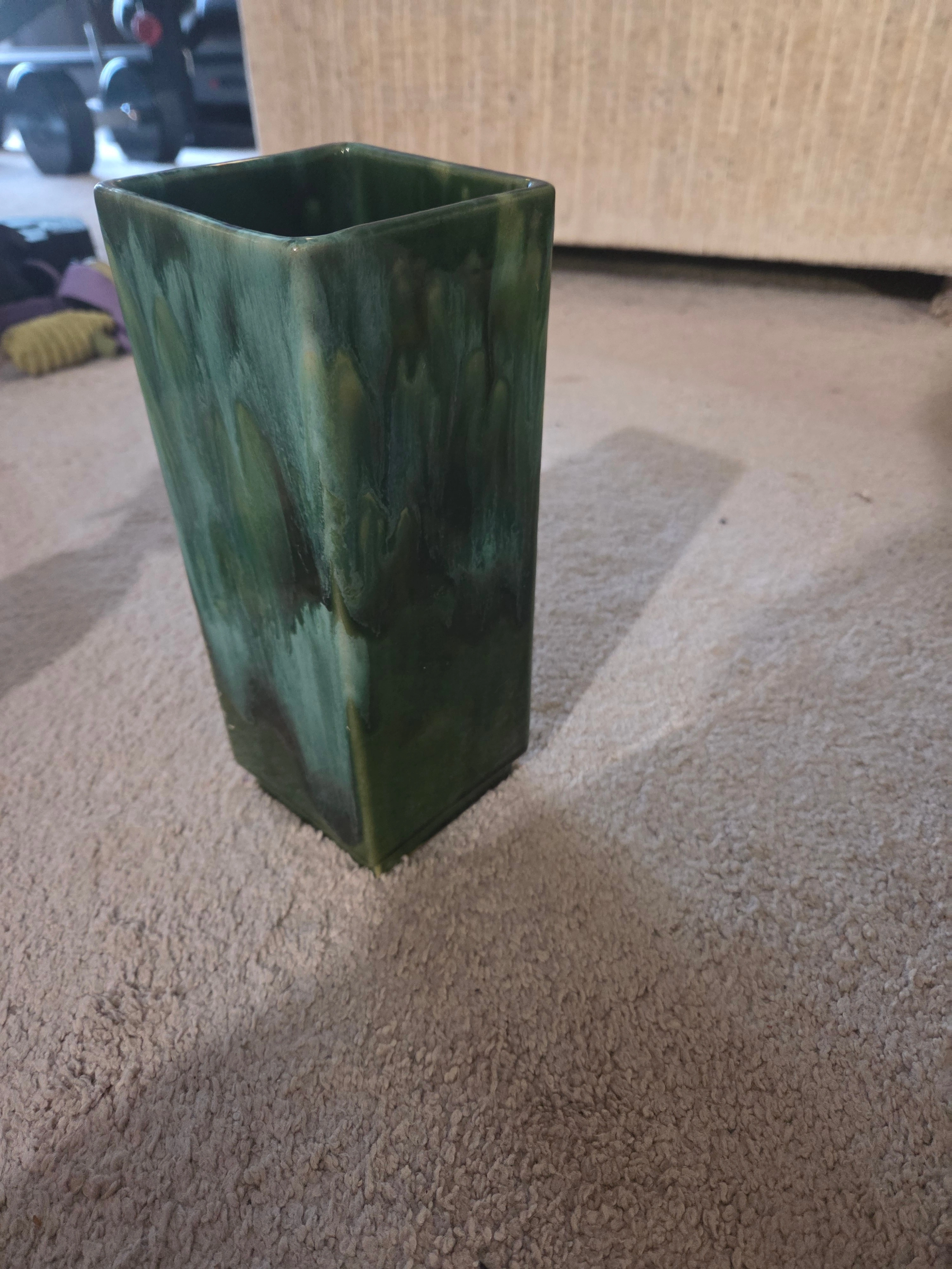 A striking piece of Canadian art pottery from the renowned Céramique de Beauce (Quebec). This heavy, rectangular vase features a beautiful forest green variegated drip glaze.