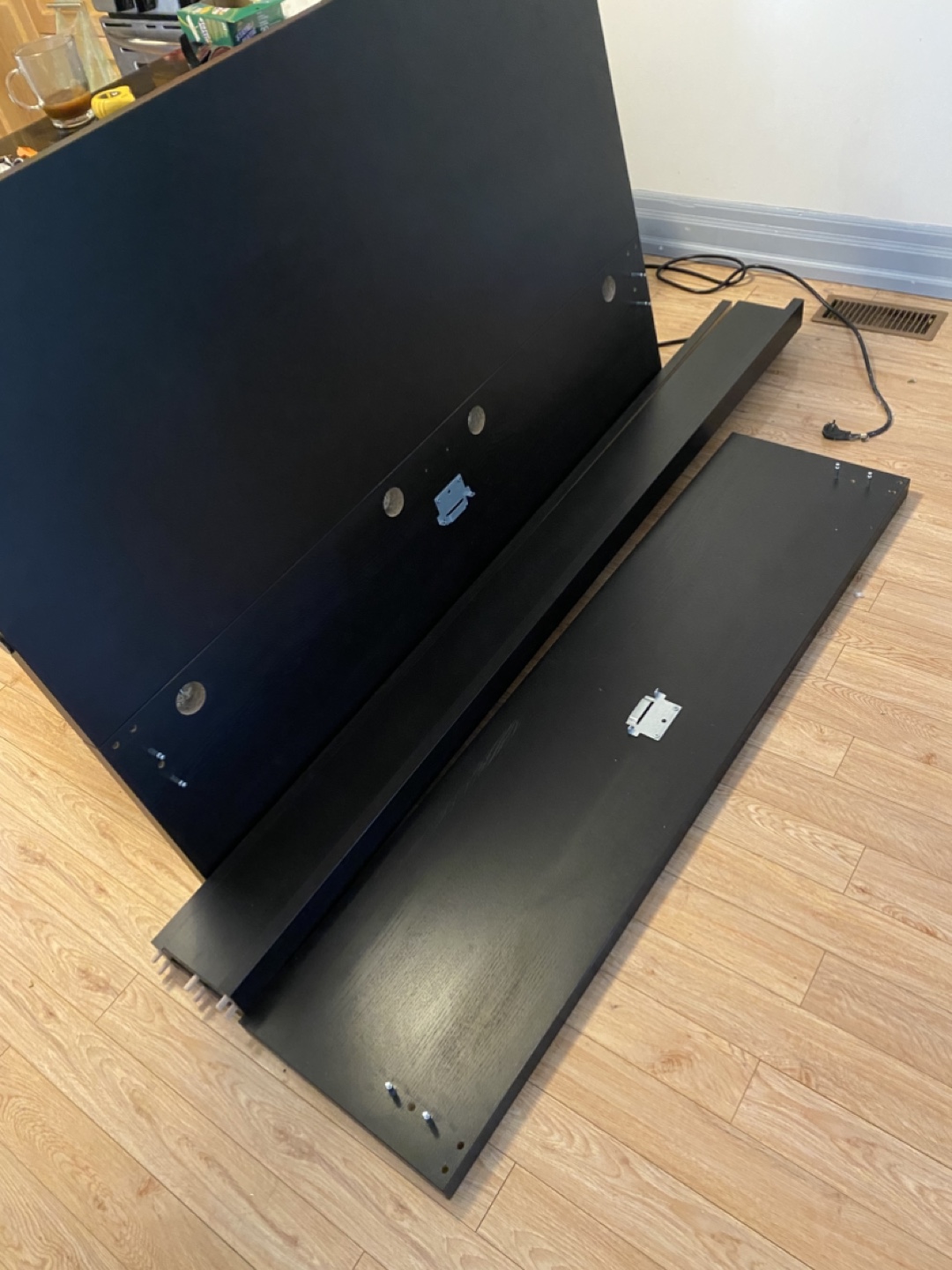 Bed frame, with storage boxes. Black finish, with a headboard. Great for a peaceful night's rest.