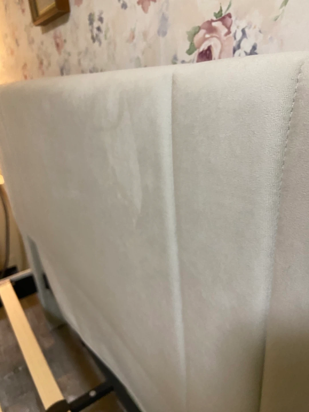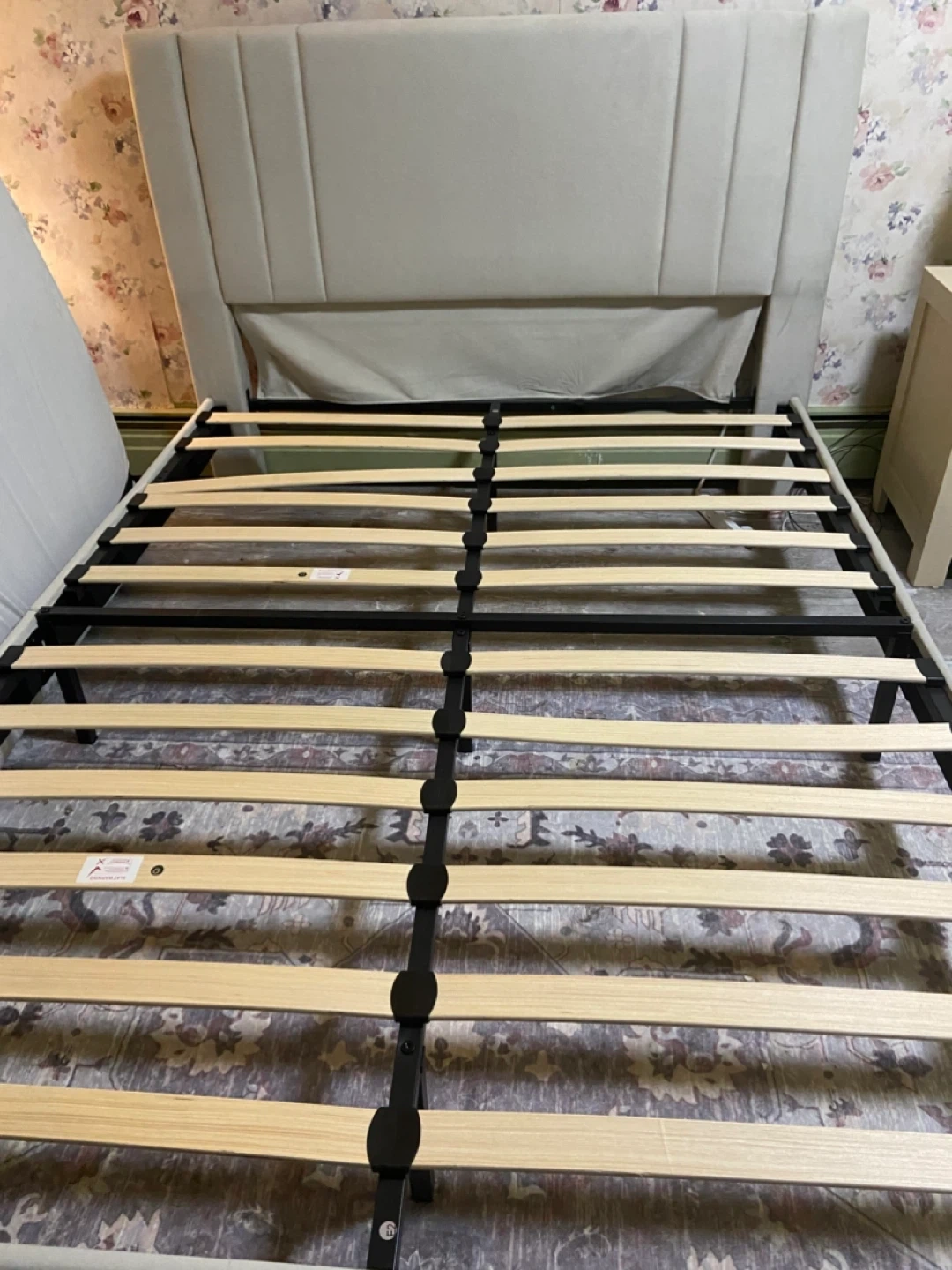This is a light creamy ivory upholstered headboard and bed frame. It features a slat system for mattress support. Includes the frame and headboard, mattress not included.