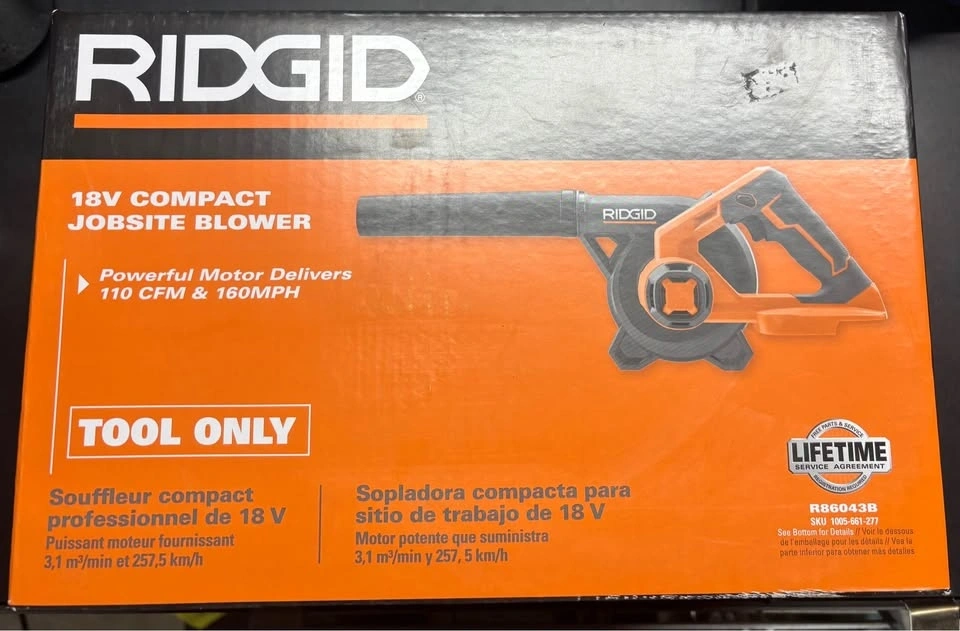 Powerful RIDGID 18V compact jobsite blower. Great for quick cleanups on the job or around the house. This is a tool only item, no battery or charger. Has a lock-on switch and variable-speed trigger. Delivers 110 CFM and 160 MPH. Model R86043B.