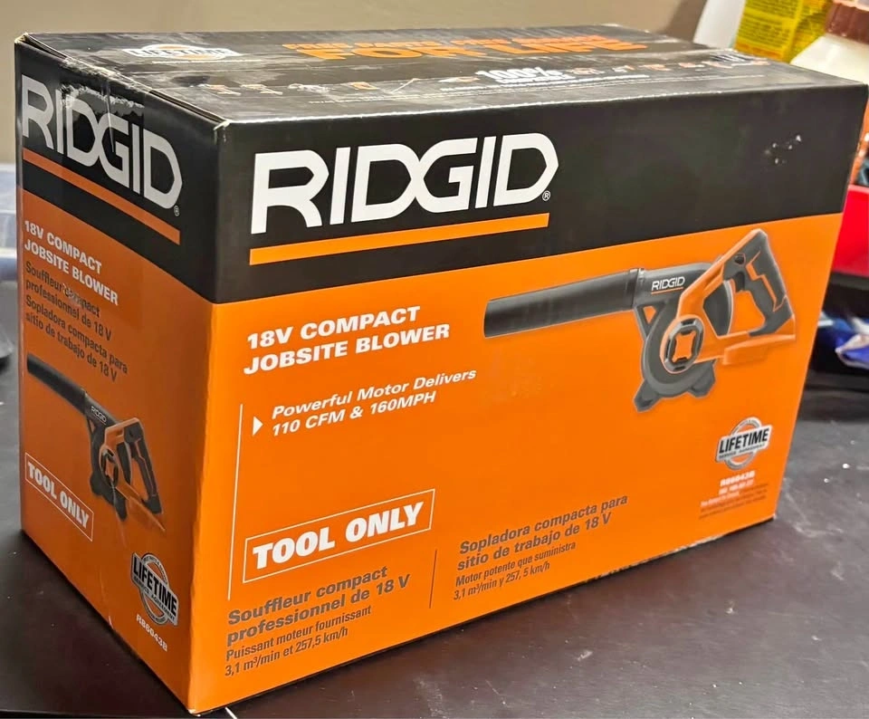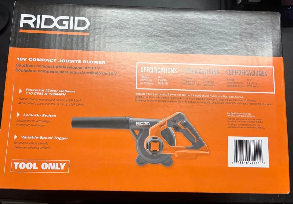 Powerful RIDGID 18V compact jobsite blower. Great for quick cleanups on the job or around the house. This is a tool only item, no battery or charger. Has a lock-on switch and variable-speed trigger. Delivers 110 CFM and 160 MPH. Model R86043B.