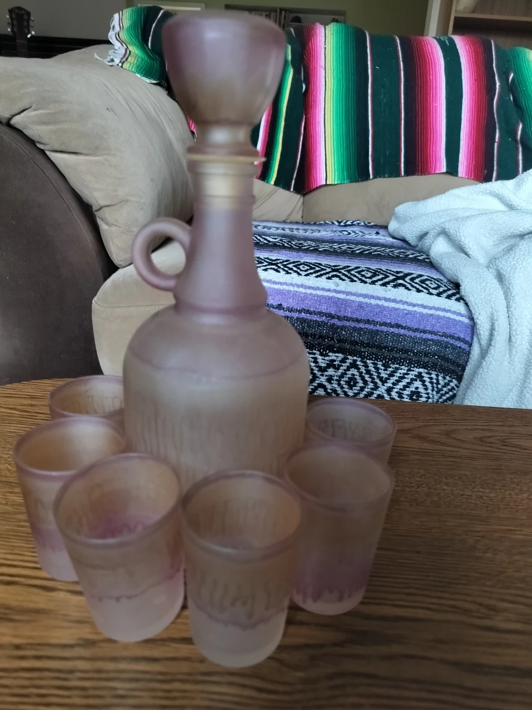 This set includes a frosted pink glass decanter with a handle and six matching shot glasses. The frosted finish and subtle pink hue give it a vintage feel. It's perfect for serving spirits.