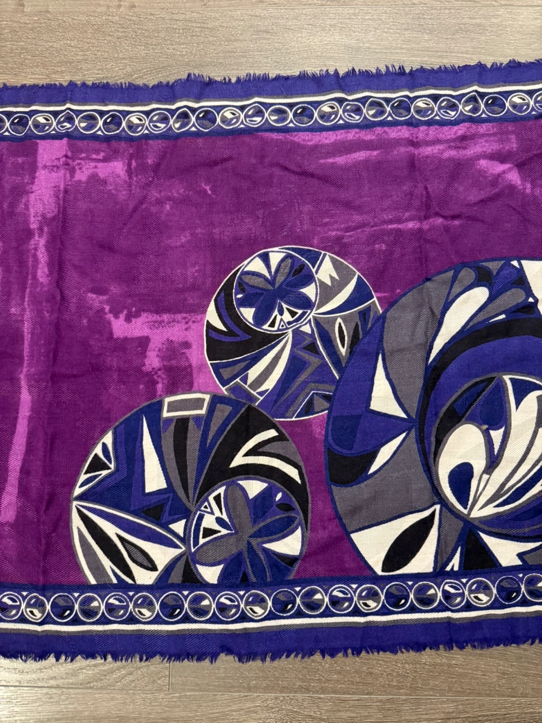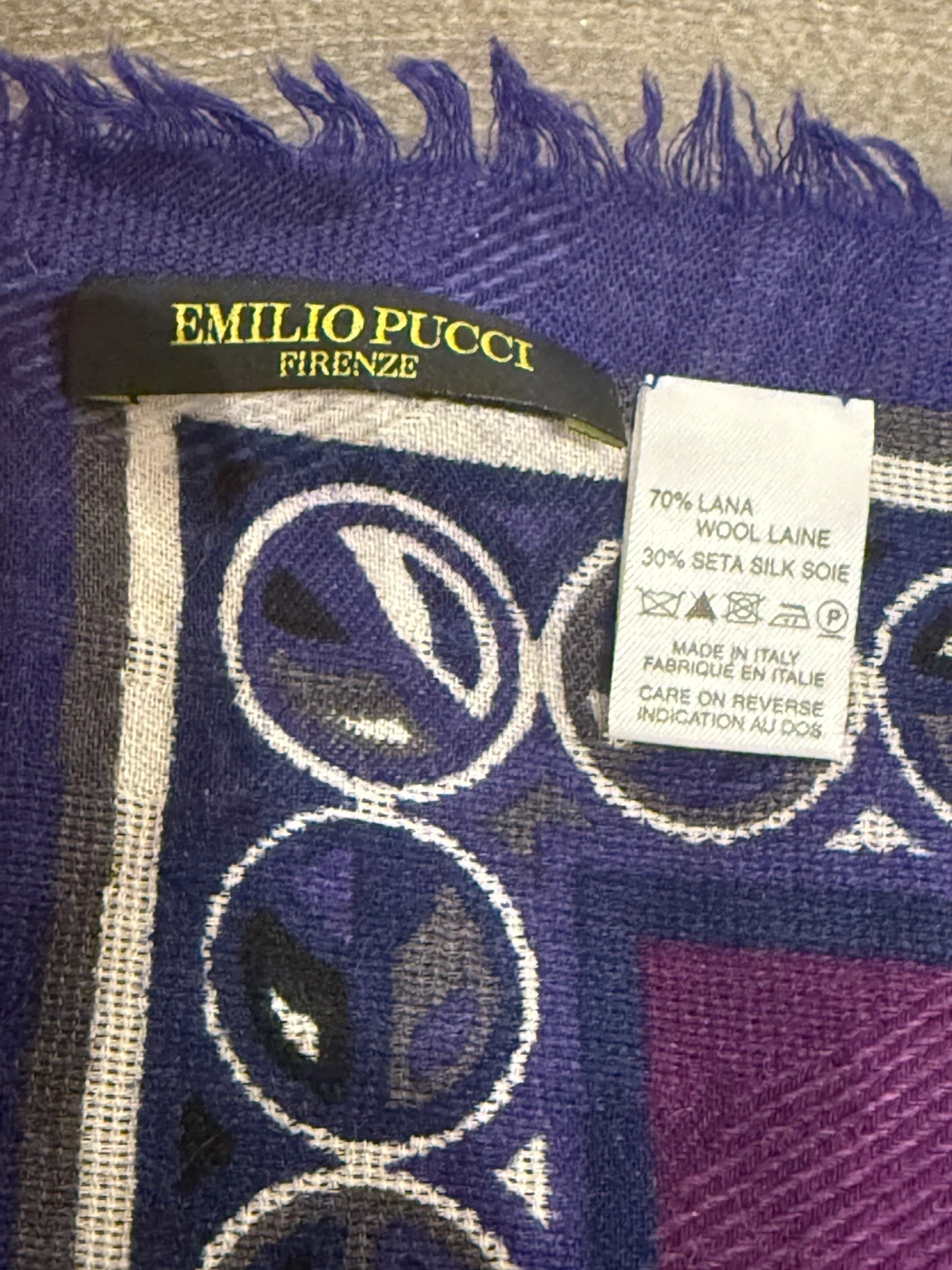 Authentic Emilio Pucci scarf made in Italy. It's a blend of 70% wool and 30% silk, giving it a soft and luxurious feel. The scarf features a unique design in shades of purple, blue, black, and white.