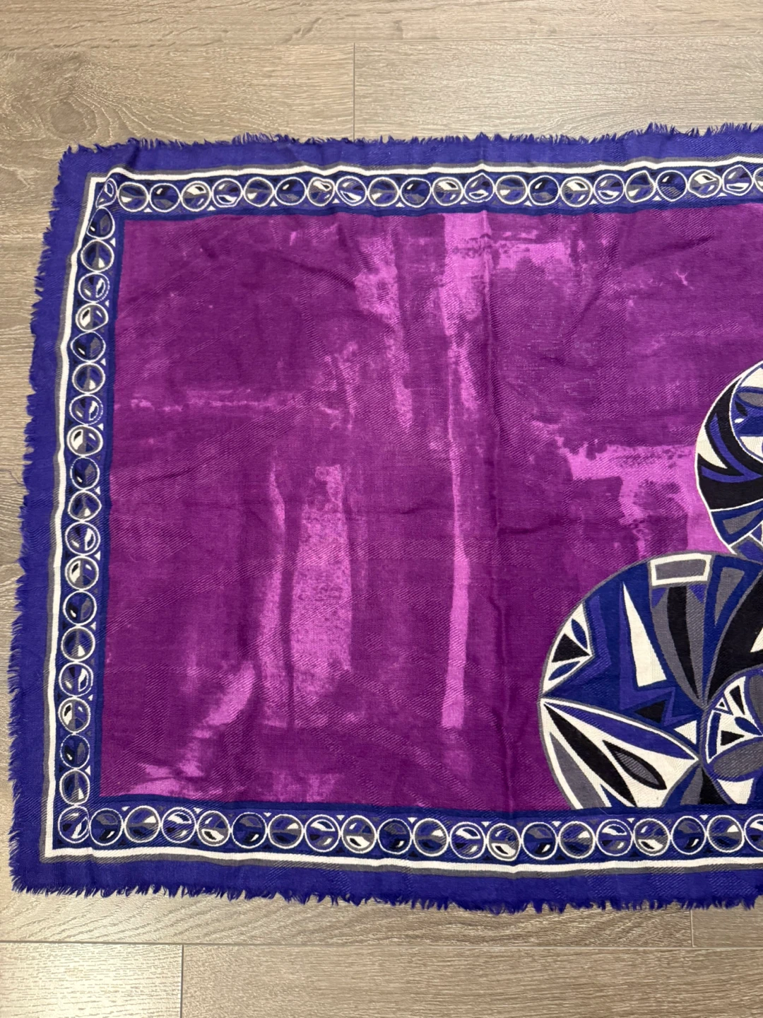 Authentic Emilio Pucci scarf made in Italy. It's a blend of 70% wool and 30% silk, giving it a soft and luxurious feel. The scarf features a unique design in shades of purple, blue, black, and white.