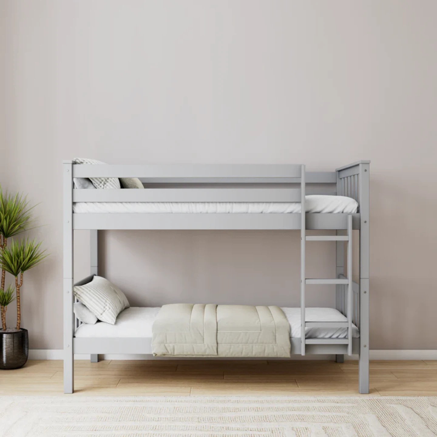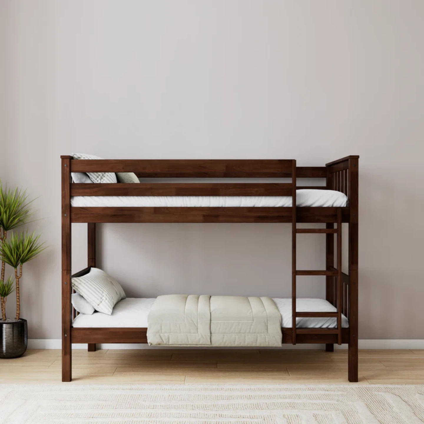 This is a twin bunk bed. It's made of wood. The bed comes with a ladder for easy access to the top bunk. It's a great space-saving solution for bedrooms!
