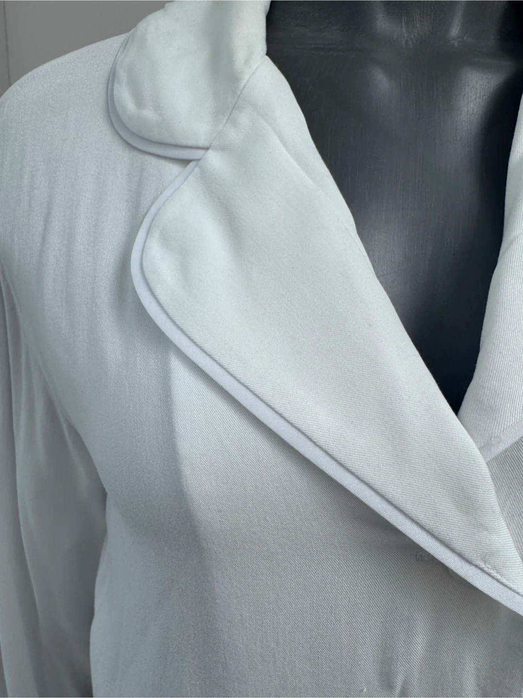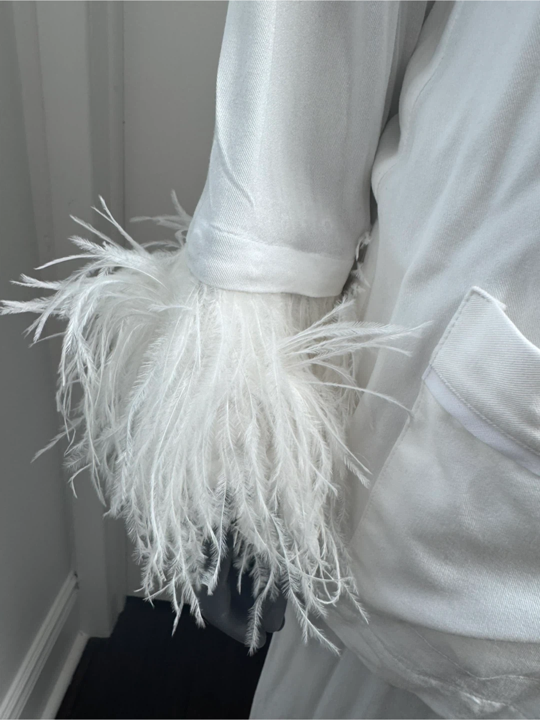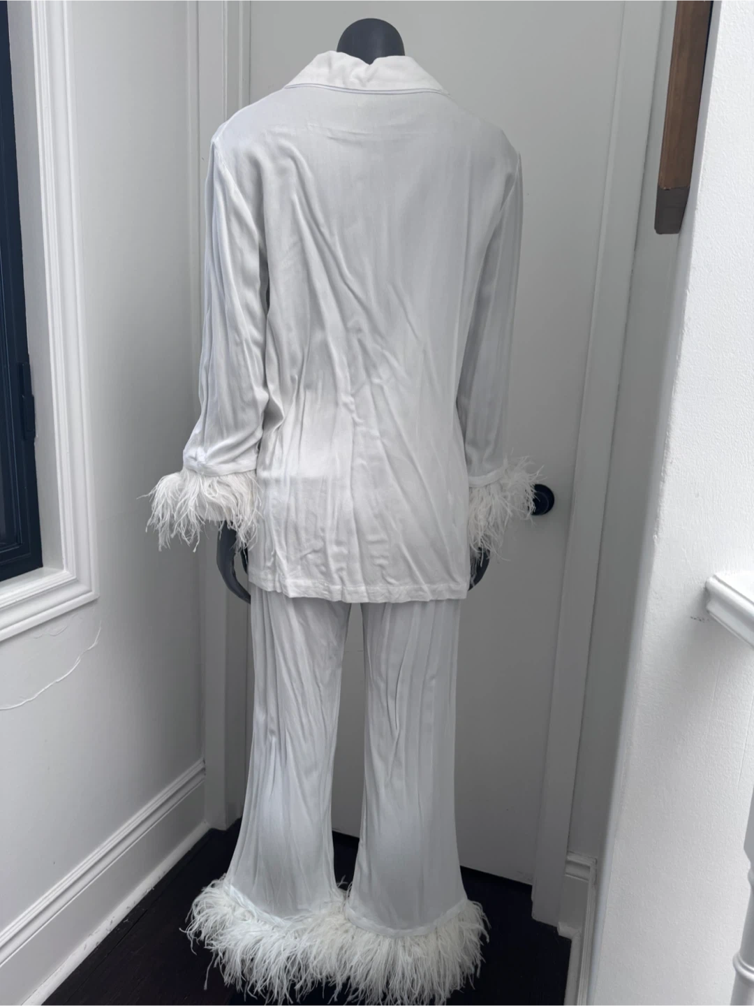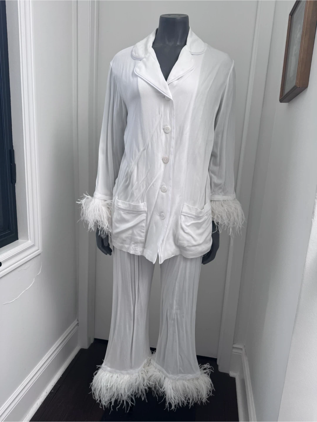 Luxurious white pajama set by Sleeper. It features a classic button-up shirt and matching pants. The cuffs and hem are adorned with soft feather trim. This set offers comfort and style for lounging. Never worn.